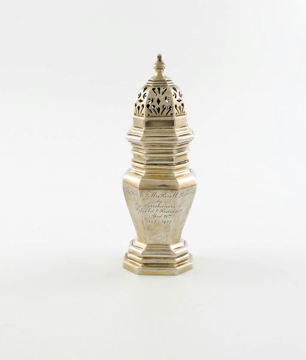 octagonal baluster form, the pull-off cover with a knop finial, with a presentation inscription, height 16cm, approx. weight 5.8oz.