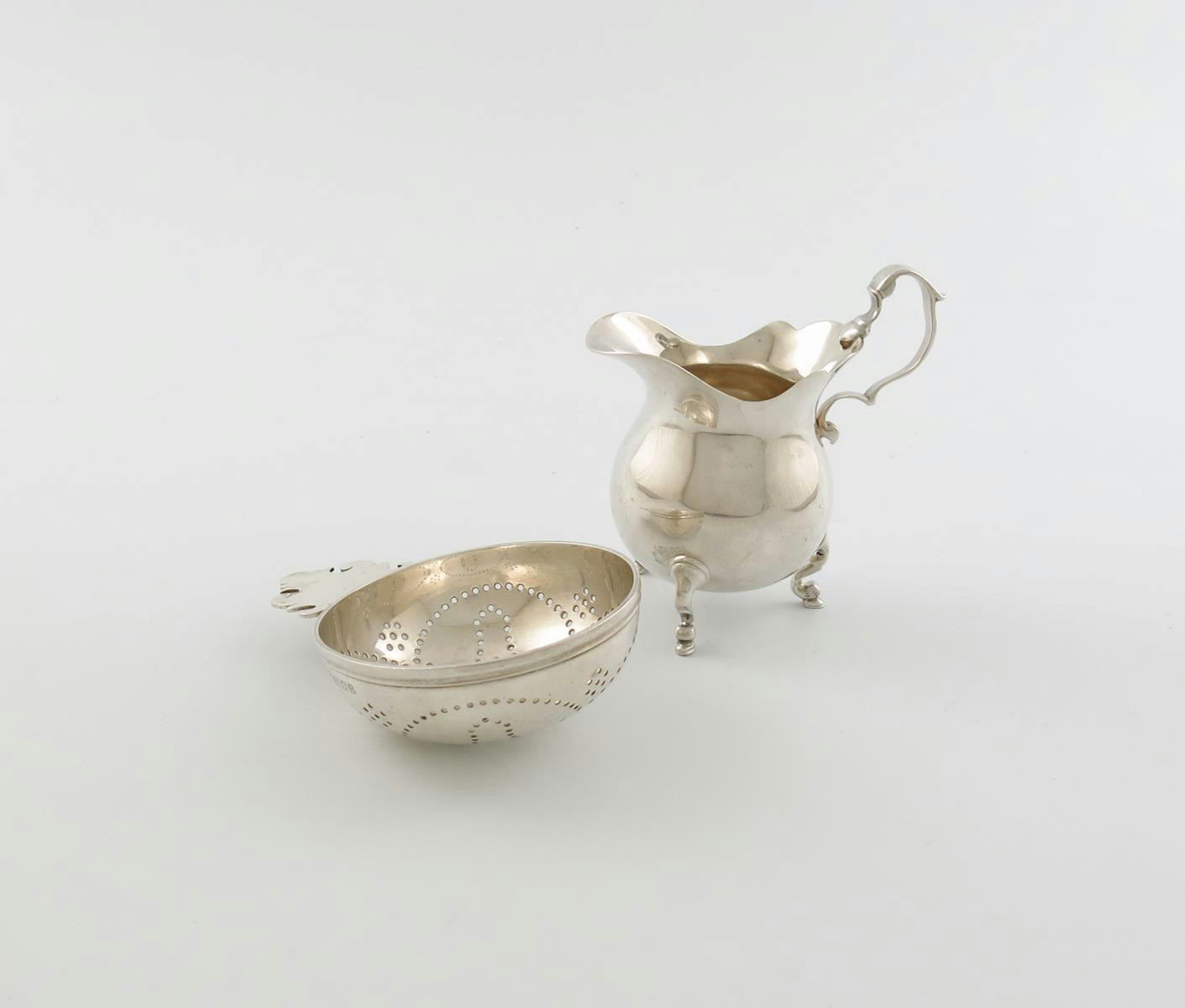baluster form, scroll handle, on three scroll legs, height 10.3cm, plus a silver lemon strainer, by Lionel Crichton, London 1936, approx. weight 7.5oz. (2)