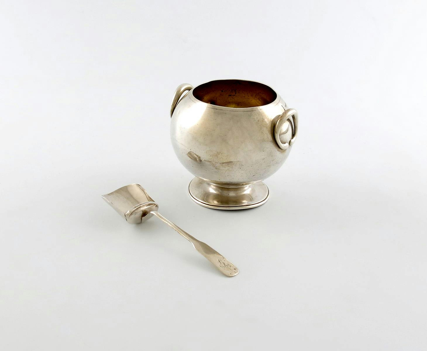 circular cauldron form, scroll side handles, gilded bowl, on a circular foot, height 7.8cm, plus a George III silver Fiddle pattern caddy spoon, by Joseph Taylor, Birmingham 1797, approx. weight 7oz. (2)