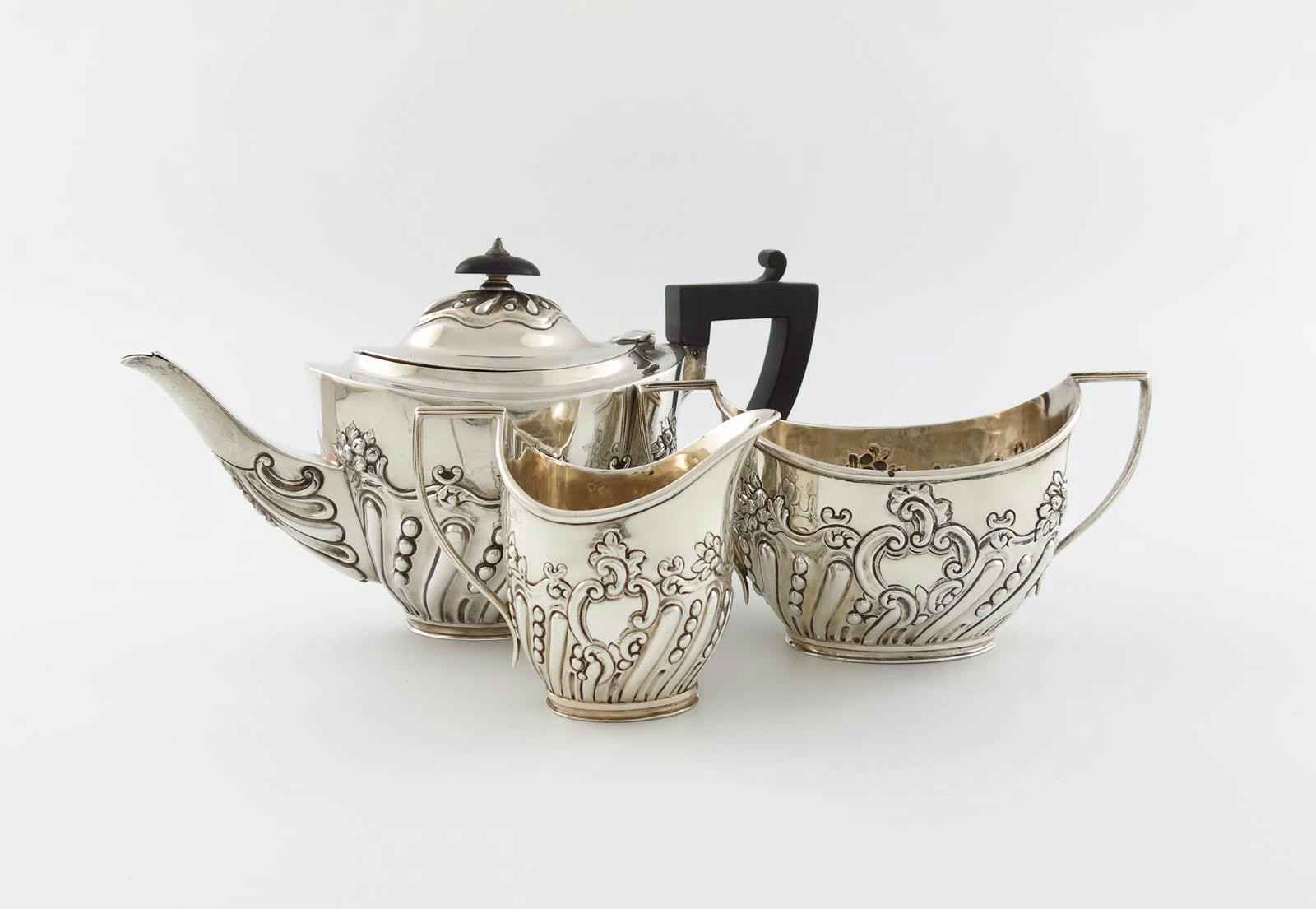 oval form, part-fluted and foliate decoration, scroll handles, approx. weight 27.5oz. (3)
