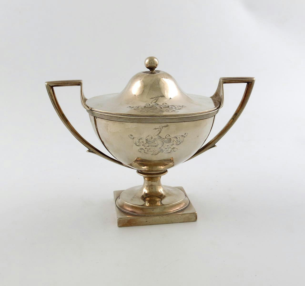 circular form, reeded scroll handles and borders, pull-off cover with a ball finial, engraved armorials, on a raised square foot, height 17cm, approx. weight 20.5oz.
