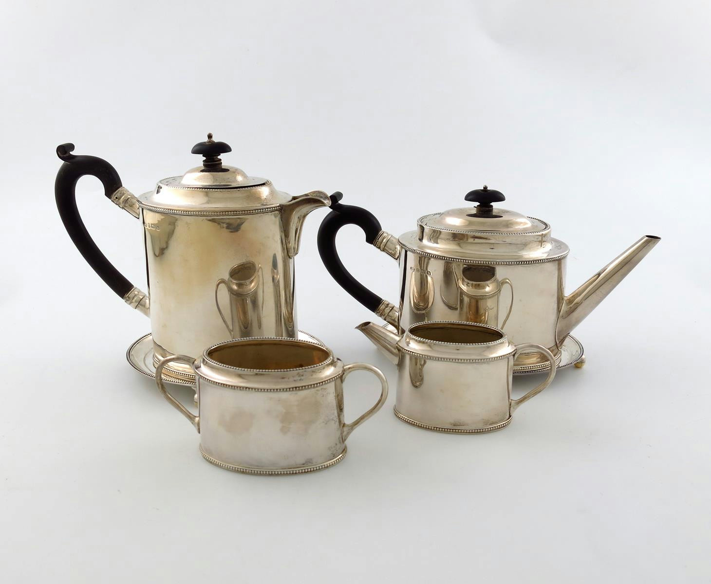 λ A matched six piece tea set, G. W. Aldridge, Birmingham 1921-24, comprising: a tea pot on stand, a hot water pot on stand, a cream jug and sugar bowl, oval form, beaded borders, scroll handles, flush hinged domed covers, the stands with presentation inscriptions, and on four ivory ball feet, approx. weight 53oz. (6)