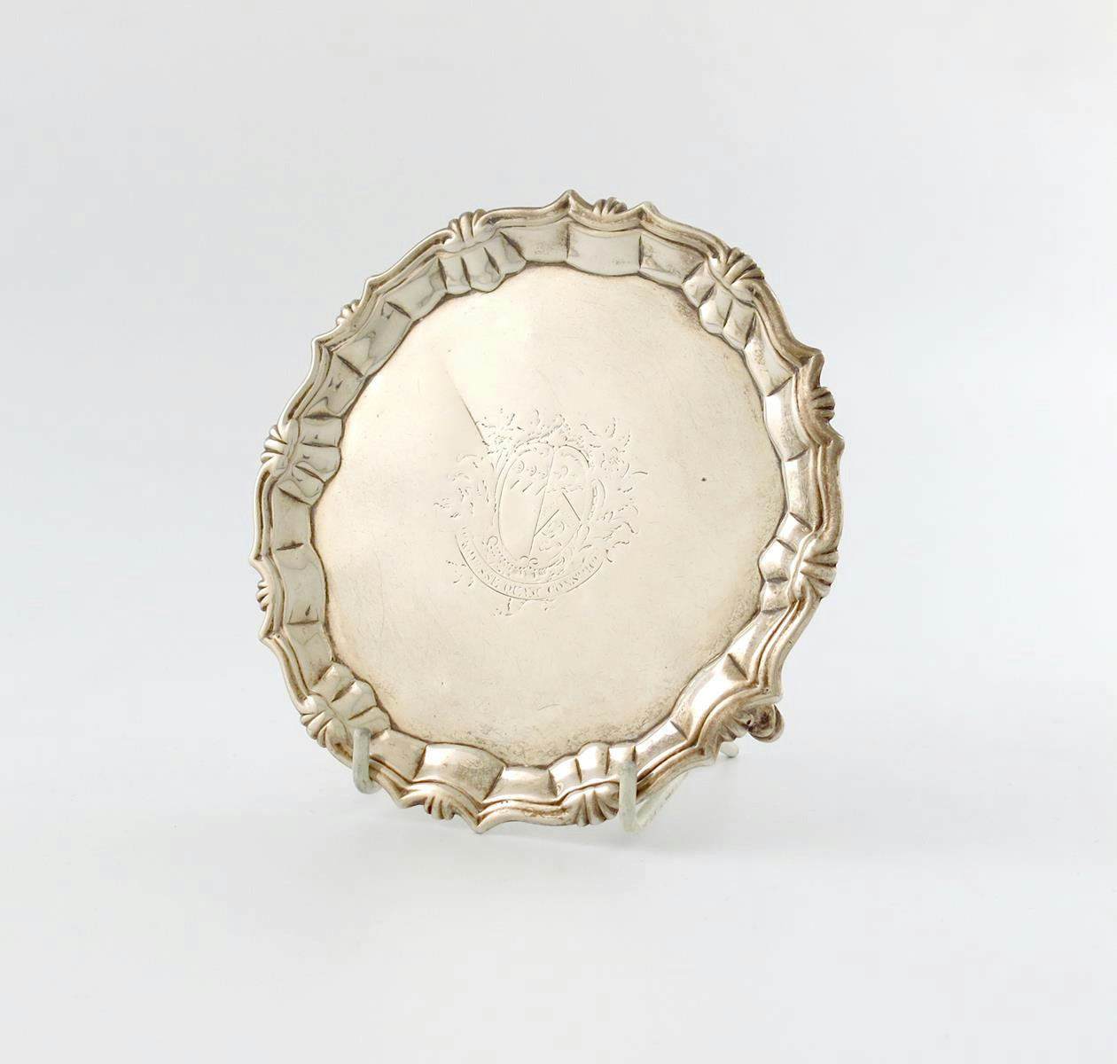 circular form, shell and scroll borders, the centre with an armorial, on three hoof feet, diameter 15.3cm, approx. weight 6oz.