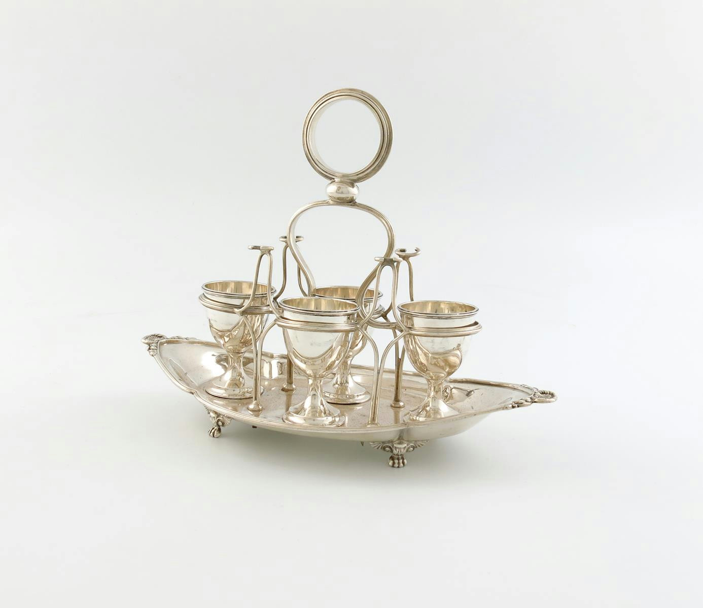 oval form, wire-work frame with a ring handle, on three paw feet, with four circular egg cups, length 25.2cm, approx. weight 16.5oz.