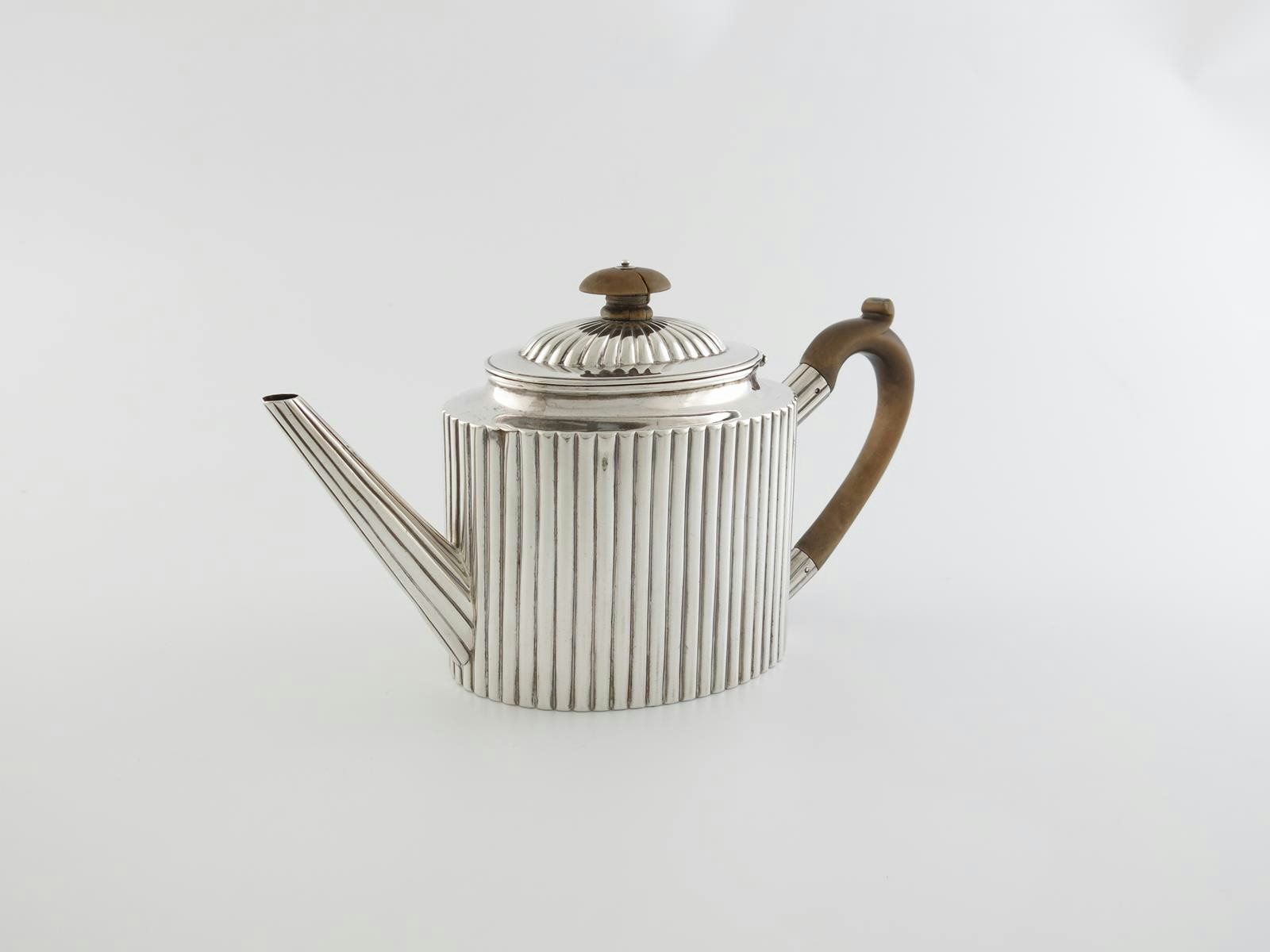 fluted oval form, scroll handle, fluted domed cover with a knop finial, engraved with a crest, length handle to spout 24.5cm, approx. weight 13.5oz.