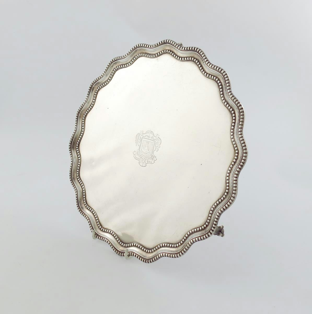shaped circular form, beaded borders, on three claw and ball feet, the front engraved with the crest of the Mercer's Company, the reverse inscribed, 'Presented by The Mercer's Company in commemoration of the completion of the 60th year of the reign of H. M. Queen Victoria 1897', and numbered '64', diameter 30.8cm, approx. weight 30oz.