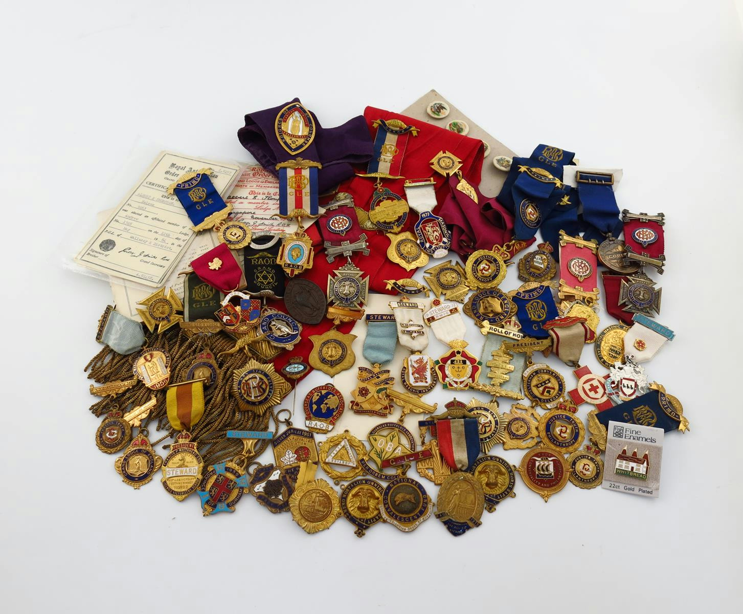 Royal Antediluvian Order of Buffaloes, silver jewels, including Grand Council, 1969; together with a quantity of jewels and badges, post World War II, mostly gilt-metal and enameled, some sashes and related material. Most very fine. (qty)