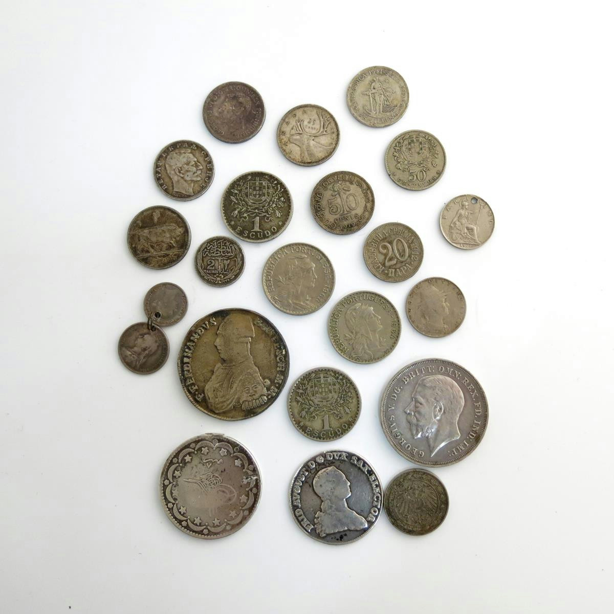 A quantity of assorted coins, including: a George V, Crown, 1935, very fine; sundry smaller coins, and a copy of a Malta 30-Tari. (qty)