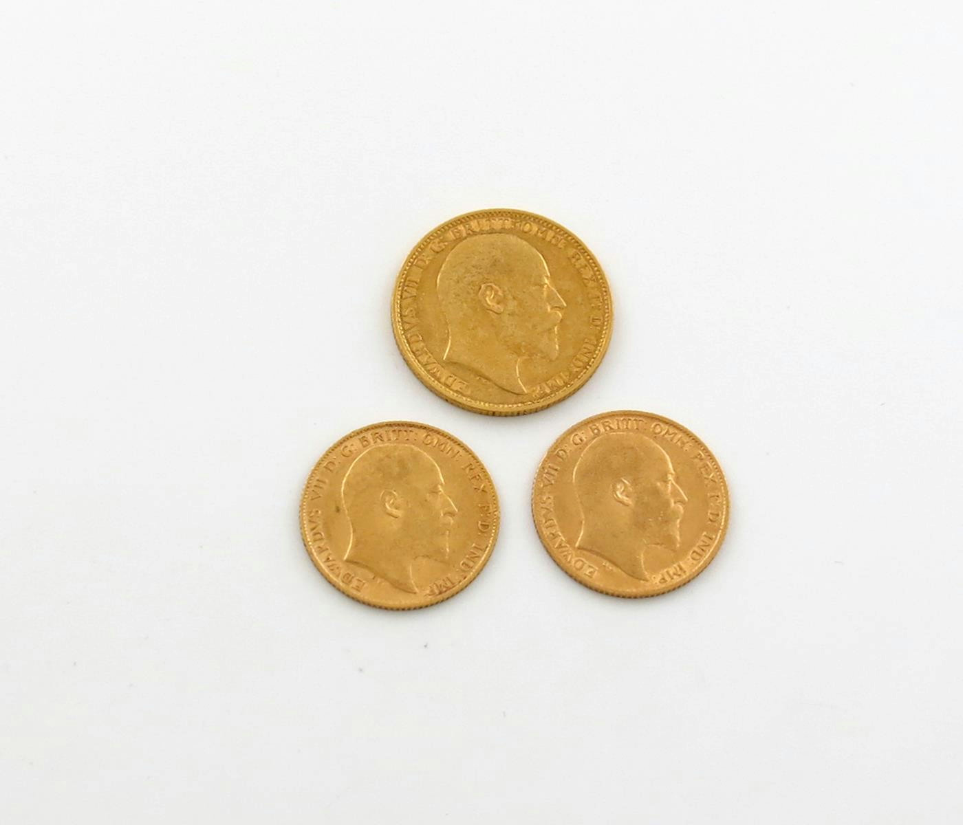Edward VII, gold Sovereign, 1905 M; Half-Sovereigns (2), 1906, 1908. Very fine. (3)
