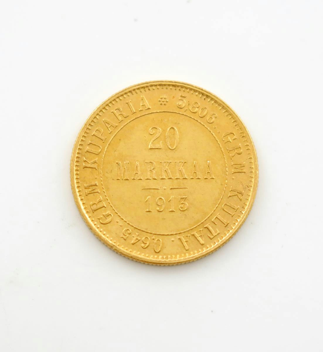 Finland, Nicholas II of Russia, 20-Markkaa, 1913 S, crowned eagle, rev., value (Fr. 3; KM 9.2). Extremely fine.