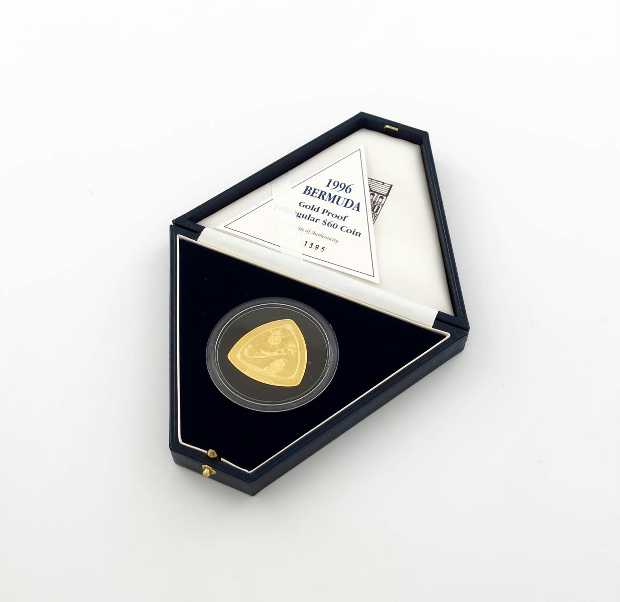 Bermuda, Elizabeth II, triangular gold Proof 60-Dollars, 1996, celebrating the infamous Bermuda Triangle, in case of issue with certificate. Brilliant mint state.