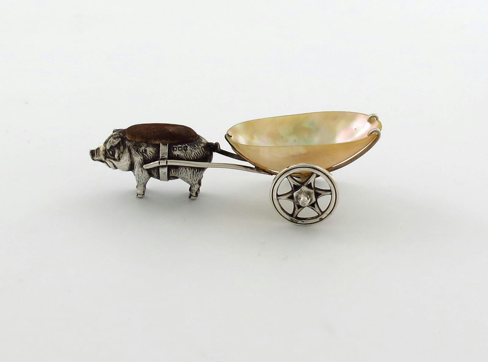 modelled as a pig pulling a cart, the cart with a mother-of pearl bowl, length 9cm.