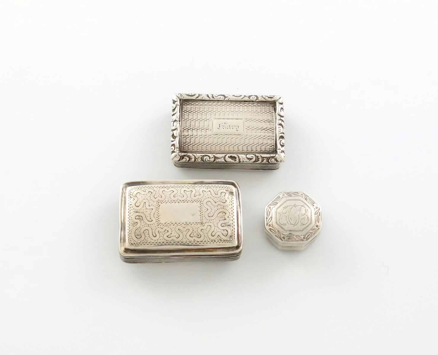 comprising: a George III one of octagonal form, by Cocks and Bettridge, Birmingham 1802, engraved decoration, initialled, plus a William IV vinaigrette of rectangular form, engine-turned decoration, (pins missing), and another vinaigrette of rectangular form, marks worn, engraved decoration, approx. total weight 1.6oz. (3)