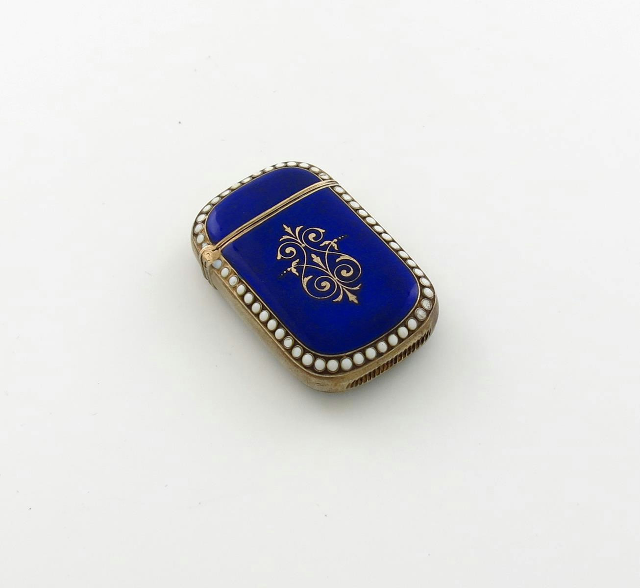 rounded rectangular form, with dark blue enamel decoration with gilt foliate scroll highlights, white beaded border, length 4.5cm, approx. weight 0.9oz.
