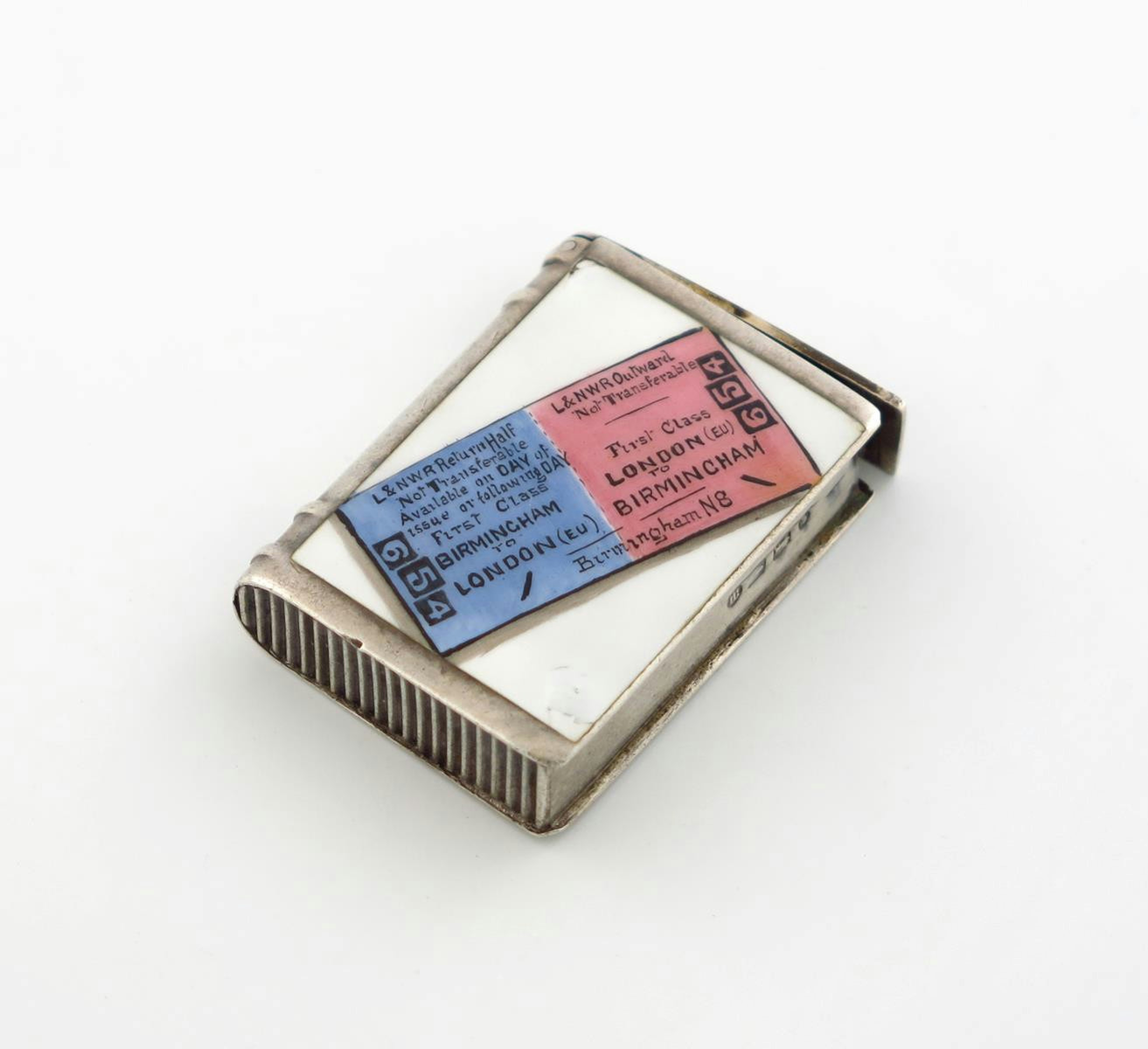 modelled as a book, hinged cover, enamelled with a railway ticket, length 4cm.