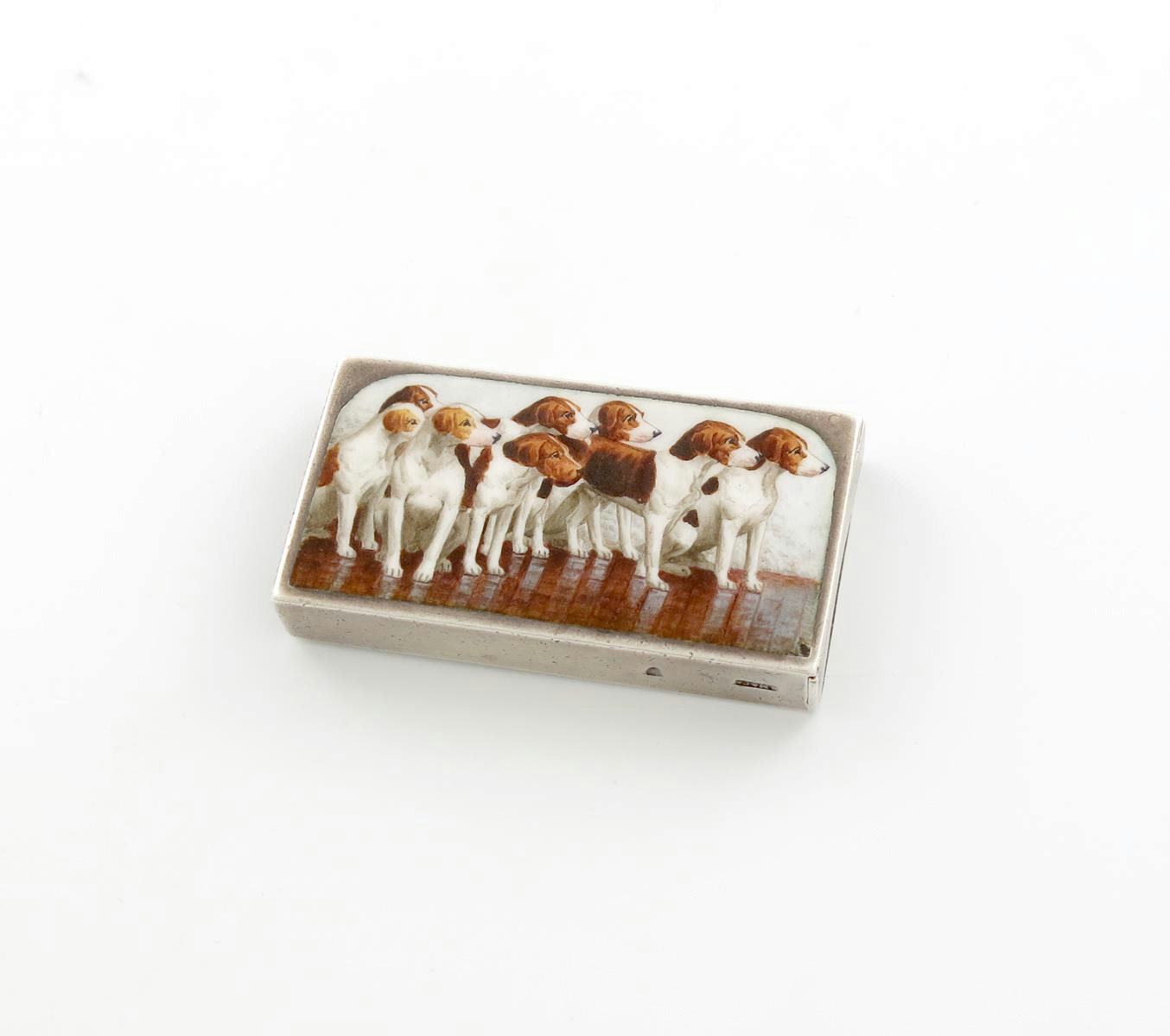 rectangular form, enamelled with a scene of seated hounds, hinged cover, length 5.8cm, approx. weight 1.3oz.