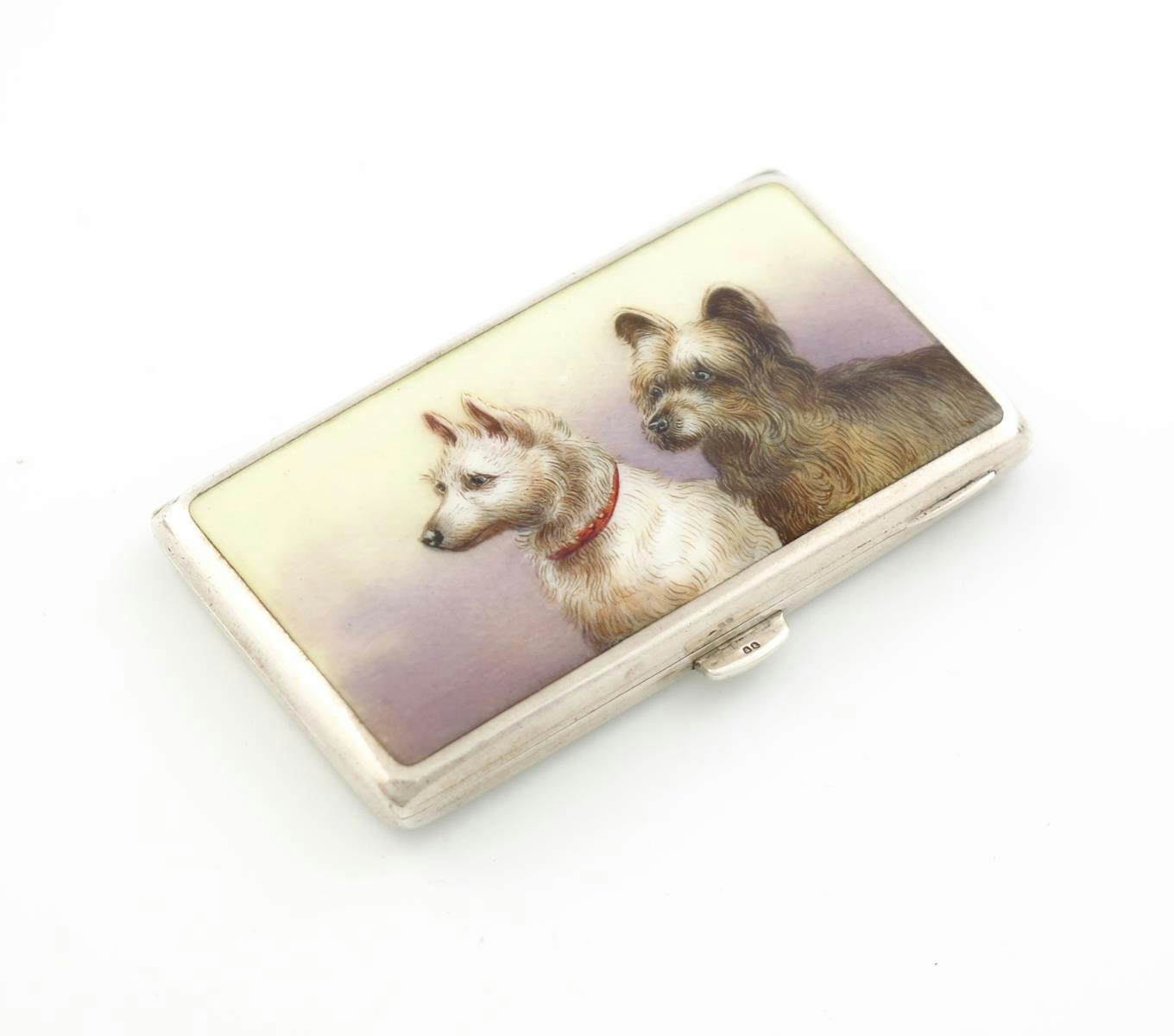 rectangular form, the hinged cover with two terriers, length 8cm, approx. weight 2.6cm.