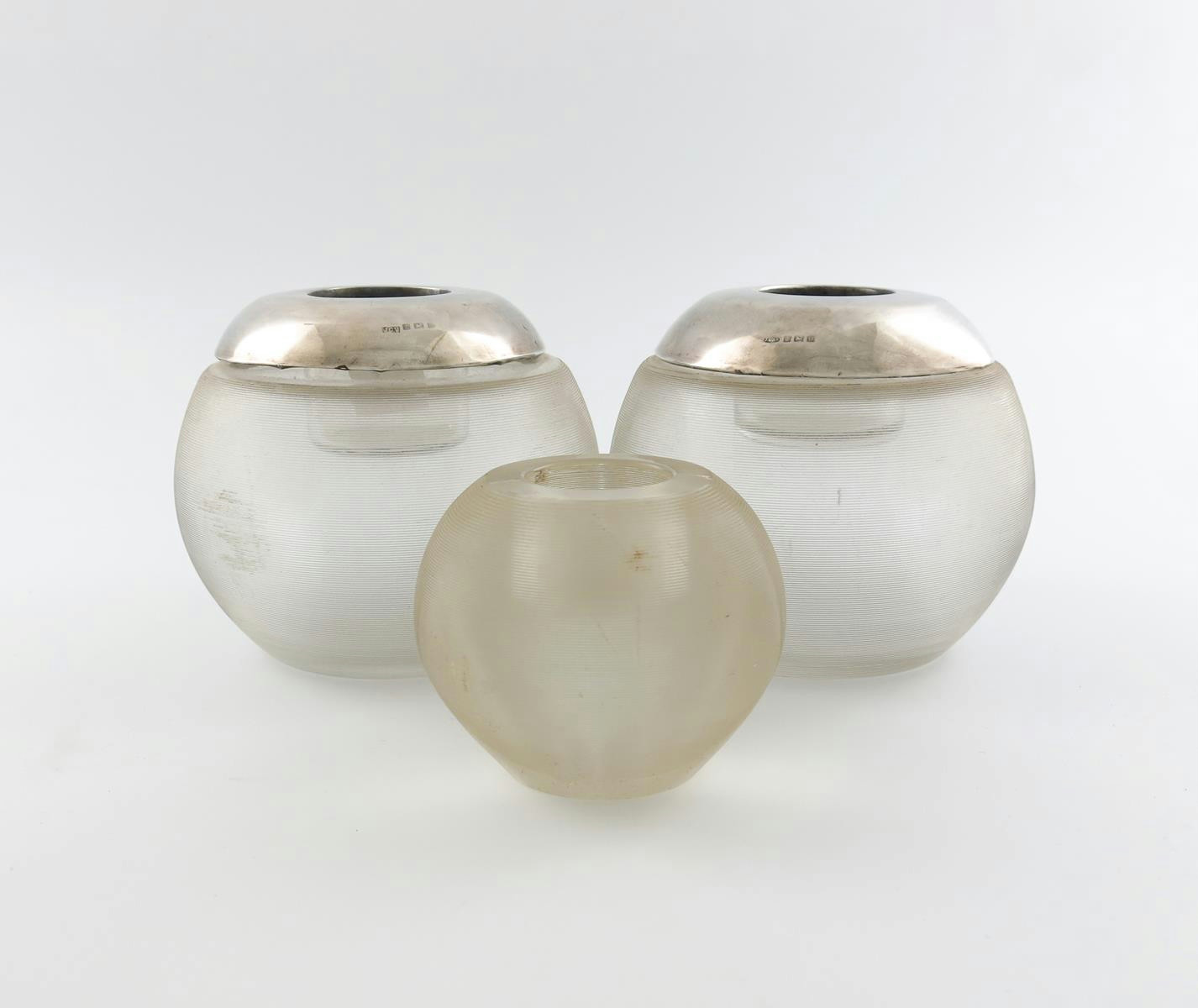 plain pull-off mounts, ribbed glass, plus a single glass table vesta striker, height of largest 12.3cm. (3)