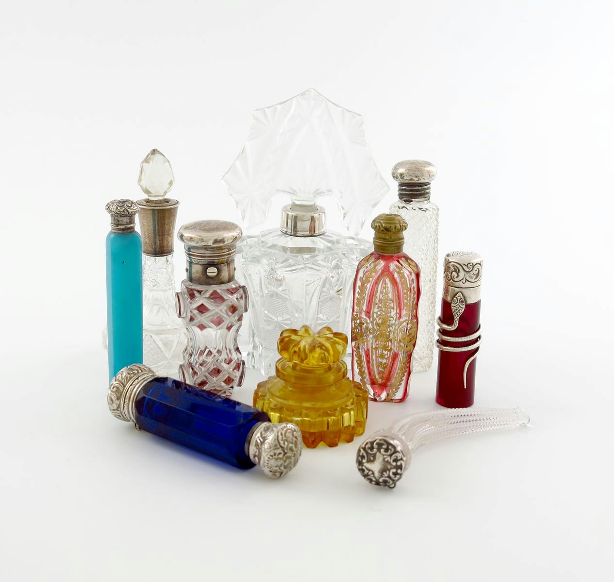 comprising: one of faceted cylindrical form, blue glass, embossed covers, one end with a pierced cover, plus an Edwardian dark red bottle, mounted with a snake, Birmingham 1902, one of tapering light blue form, embossed cover, an American silver-mounted bottle of horn form, plus four other silver mounted examples, a base-metal mounted bottle with red and gilt decoration, and a yellow glass bottle. (10)