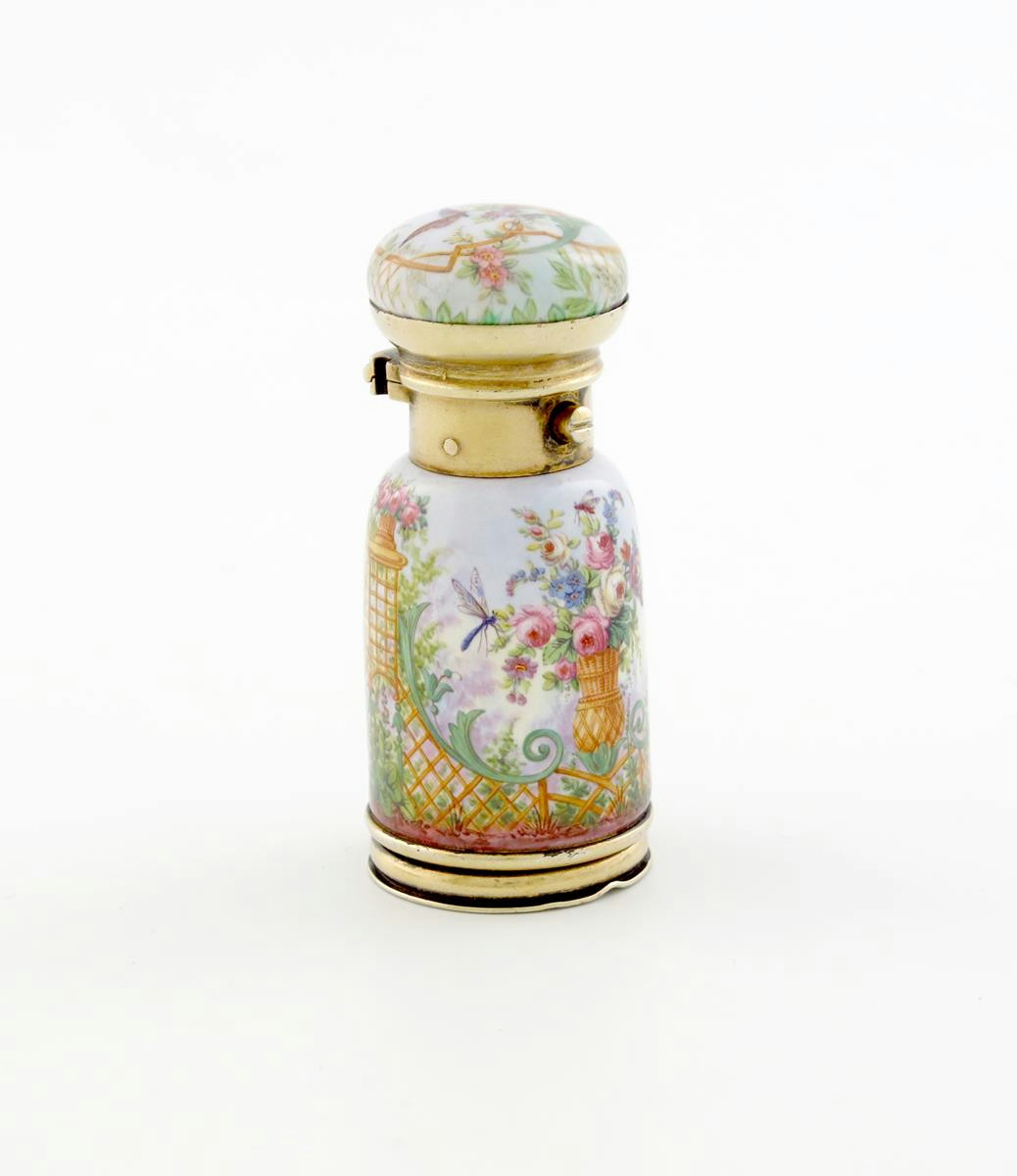 A Victorian silver-gilt and enamel scent bottle with a vinaigrette