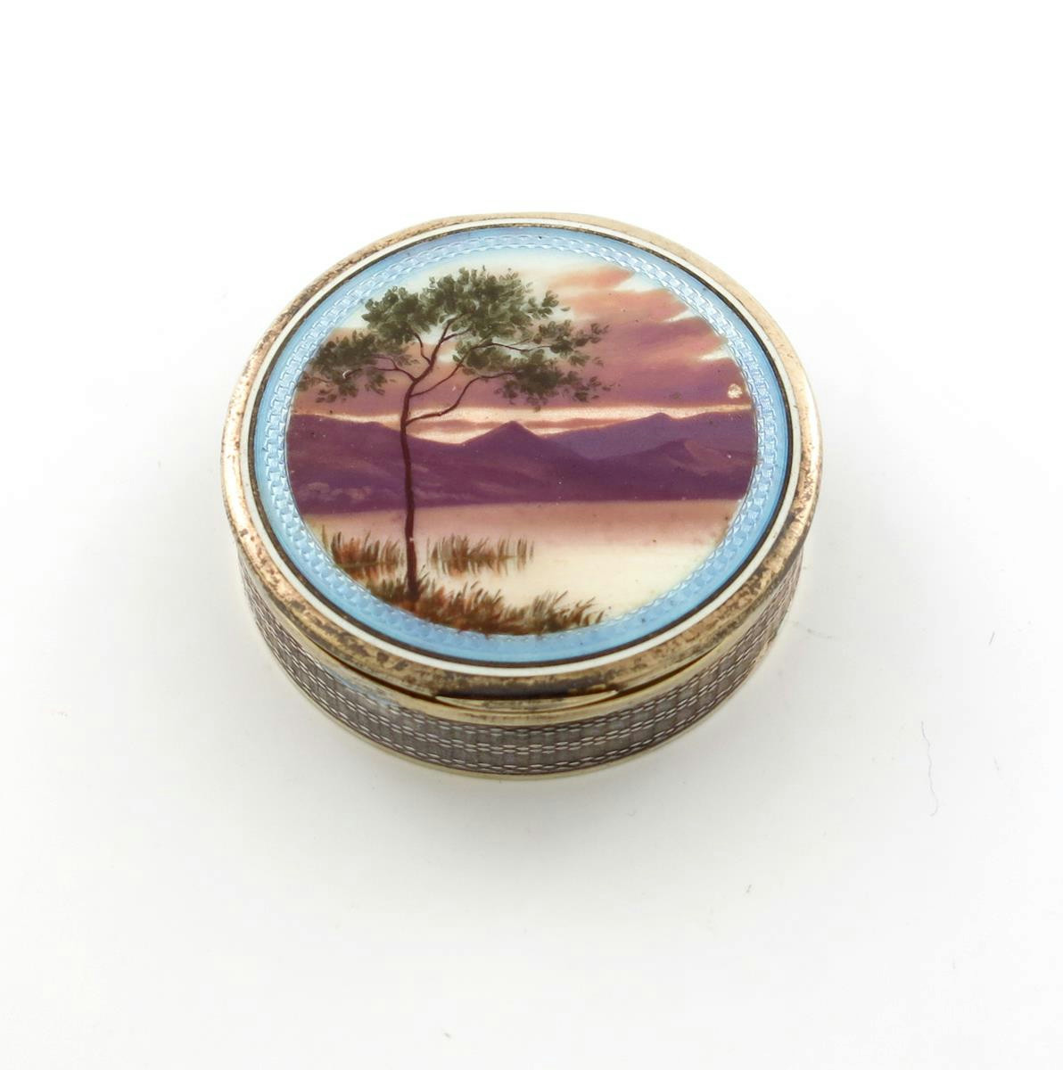 circular form, the hinged cover with a scene of a tree and a lake with mountains behind, diameter 5cm.