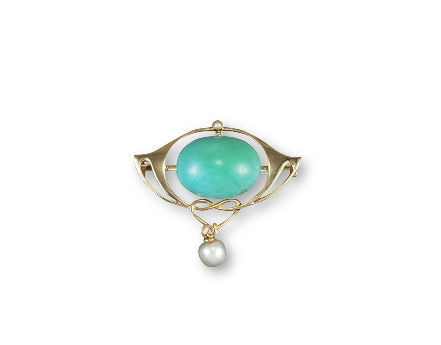 An Art Nouveau pendant by Murrle Bennet & Co, the gold mount centred with an oval shaped turquoise cabochon and suspending a pearl. Signed to the reverse with monogram.