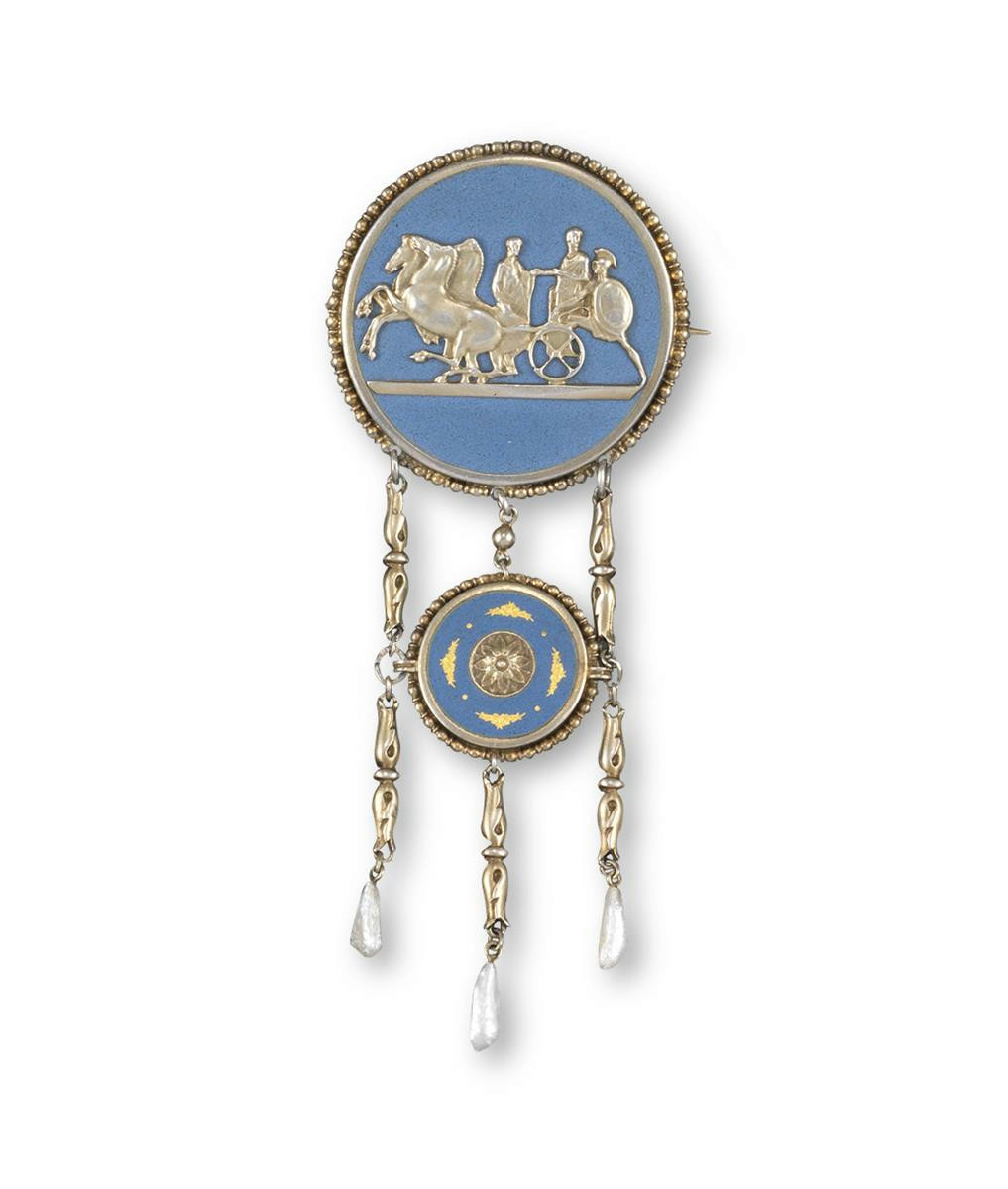 A silver brooch with blue enamel decoration by Theodor Fahrner, the upper circular disc applied with a classical scene with chariot figures and horses, suspending a smaller conforming circular disc and three pearls. Signed with initials to reverse. 3.3cm wide.