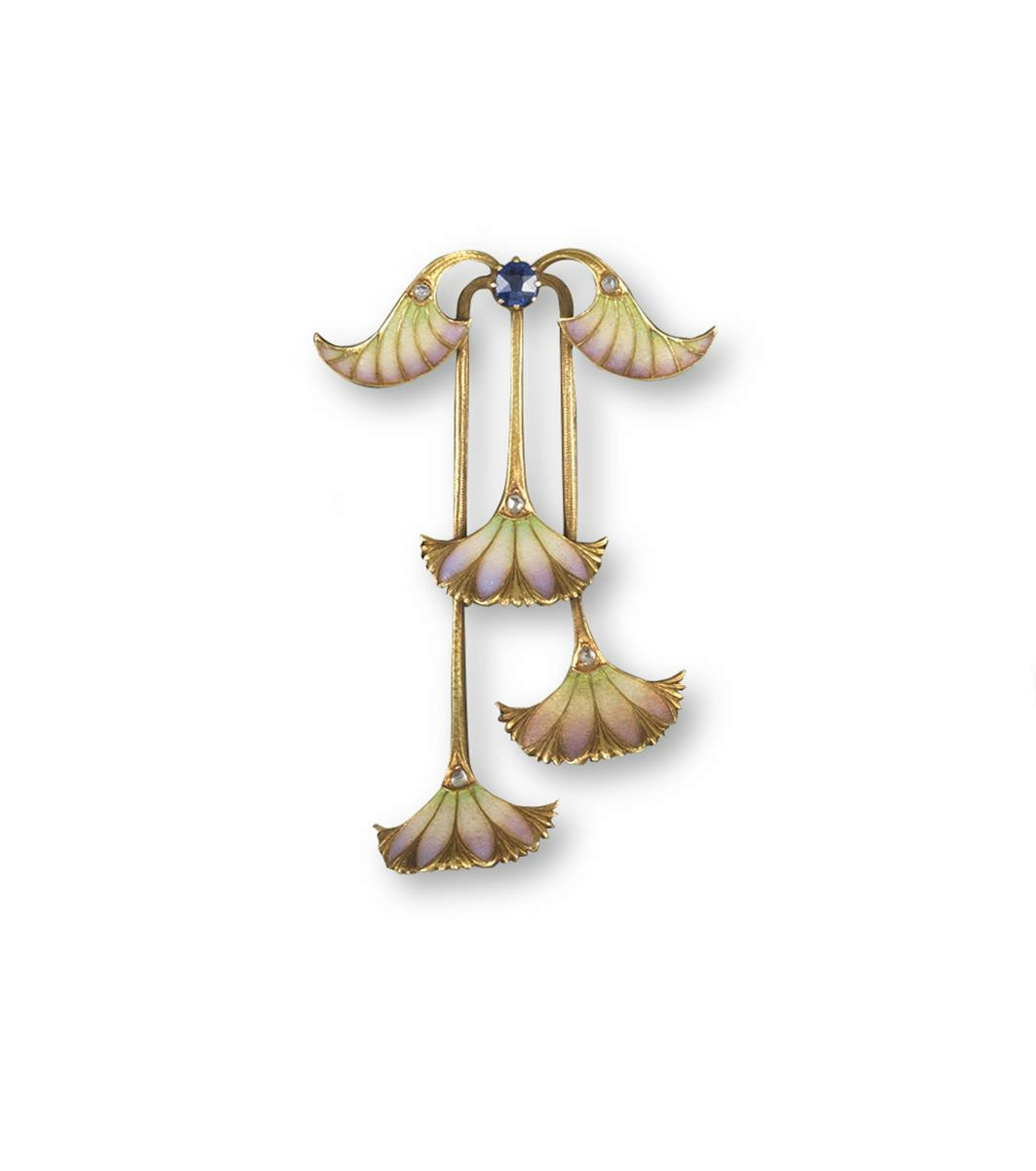 An Art Nouveau floral pendant, set with a sapphire and rose cut diamonds in gold. The petals decorated with shaded enamel. 5cm high.
