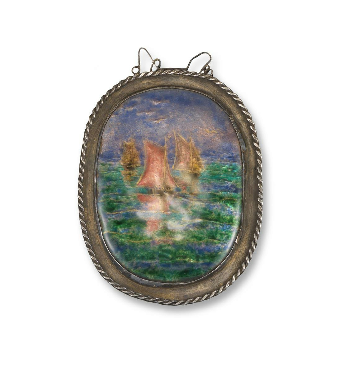 A large silver and enamel plaque, the polychrome enamel depicting sailing boats at sea, in the style of Fleetwood Varley. Within silver twisted rope border on fine link silver chain. 9.5cm high, including frame.