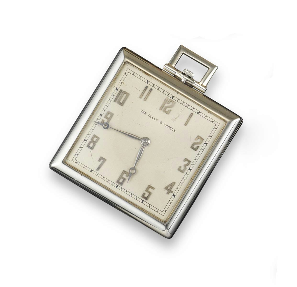 A French Art Deco open faced dress wristwatch by Van Cleef & Arpels, The signed dial applied with platinum Arabic numerals, the movement signed Vacheron & Constantin. Numbered 39672. The case marked 10376. The case stamped with French control marks. 4cm wide.