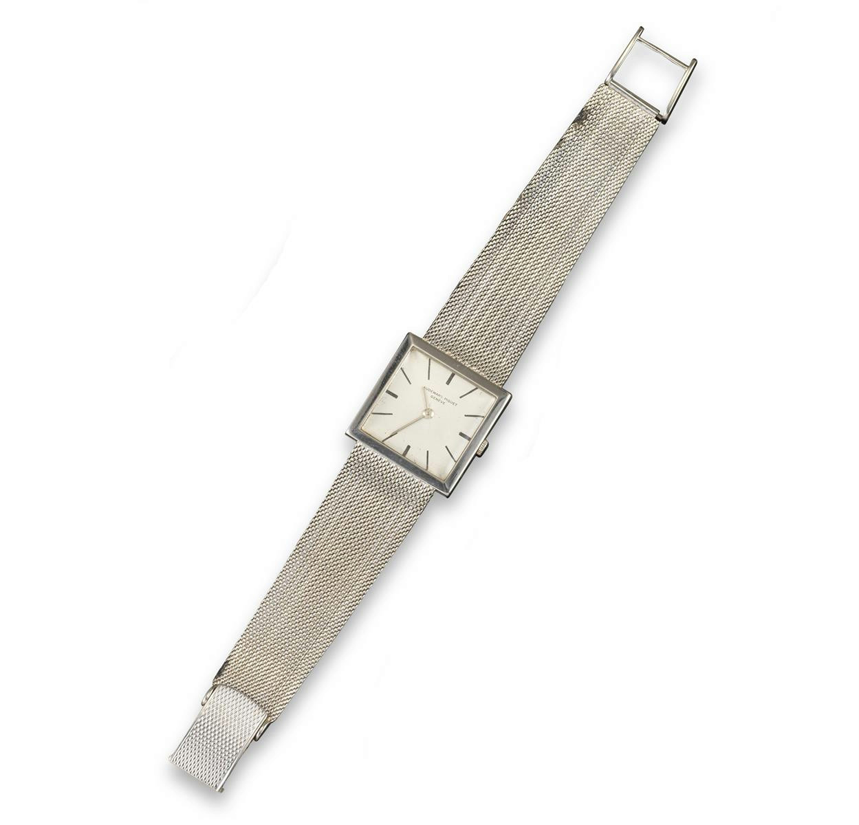 An 18ct white gold dress wristwatch, the square dial (1.9cm) signed Audemars Piguet. Case numbered 18760 on an 18ct integrated white gold band. Damaged.