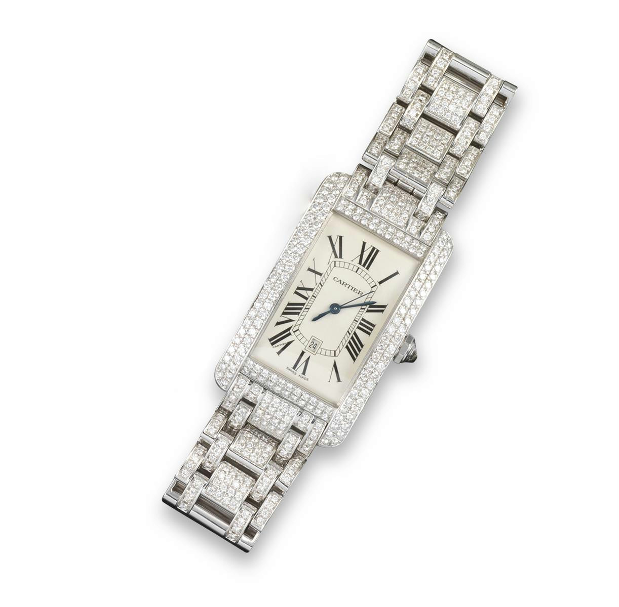 A gentleman's 18ct white gold Cartier Tank Americaine wristwatch, the rectangular signed dial (3cm long) with date aperture, swing seconds hand and black Roman numerals. Automatic winding and the signed case numbered 779219CD 1741. 18ct white gold rectangular links with 18ct white gold deployant clasp signed Cartier. Set overall with round brilliant cut diamonds. With Cartier red velvet pouch.