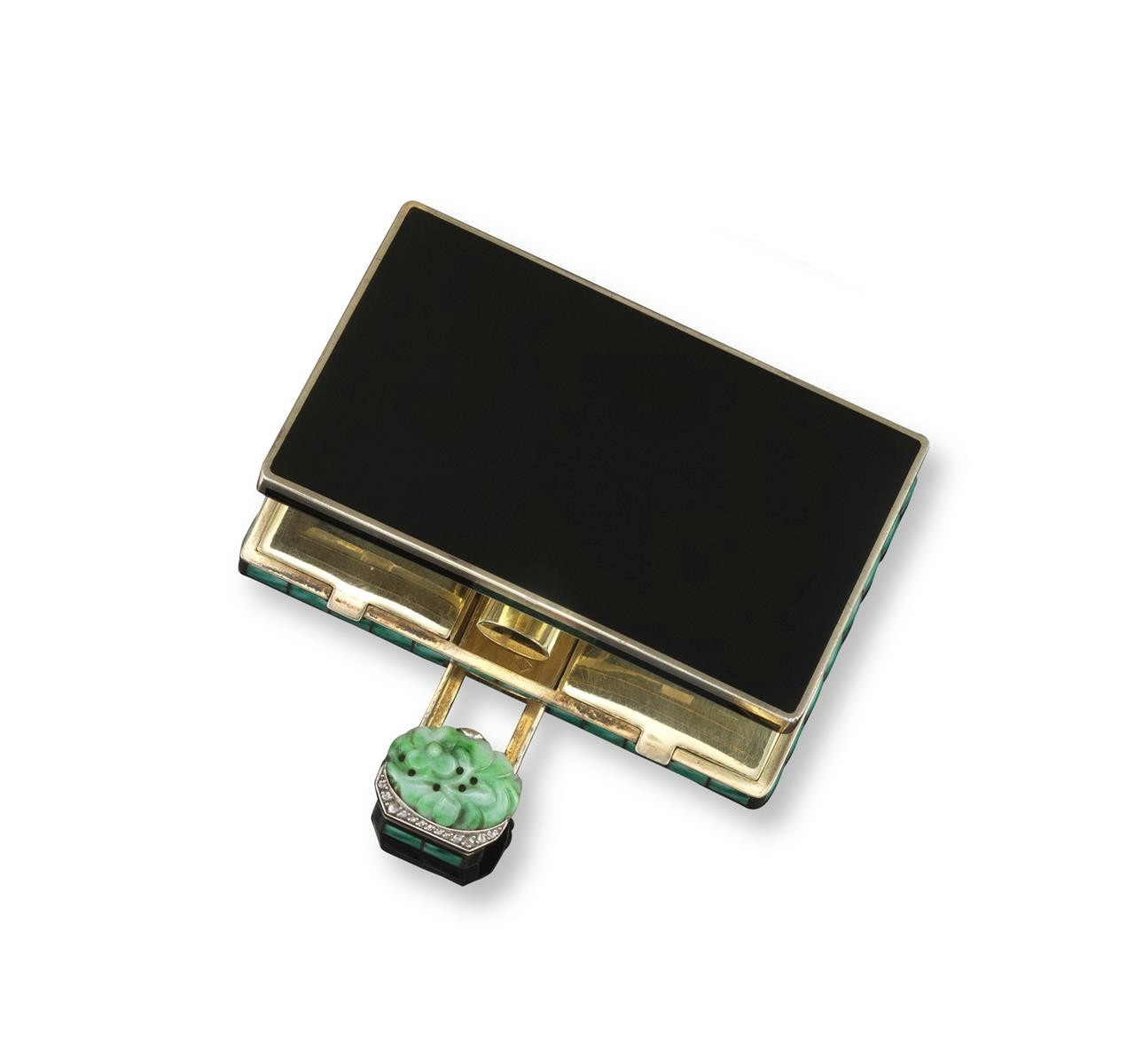 An Art Deco silver gilt minaudière, with a carved jade disc and diamond thumbpiece, black enamel to the front and back and a central border of green and white enamel panels. Containing two compartments and a lipstick holder. French control marks, makers mark AP and inventory number 3187. 7.8cm widest.