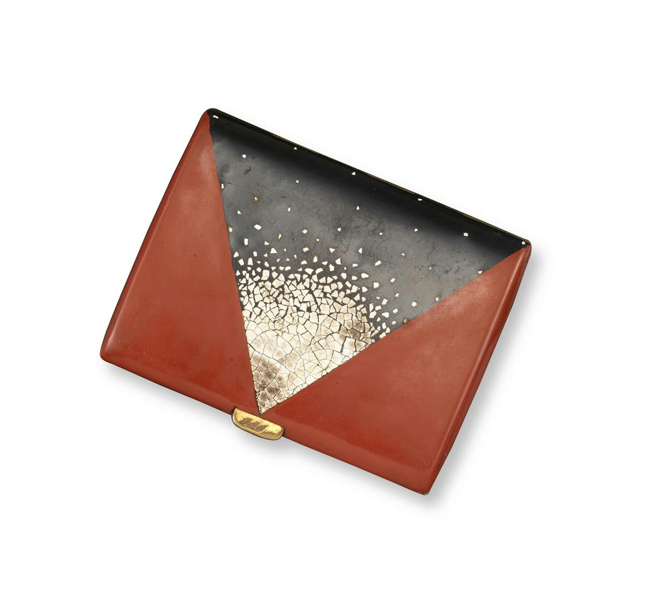 An Art Deco gilt metal cigarette case, each side divided into three sections with red enamel decoration and a central black section with fragmented white segments. 8.5cm wide.
