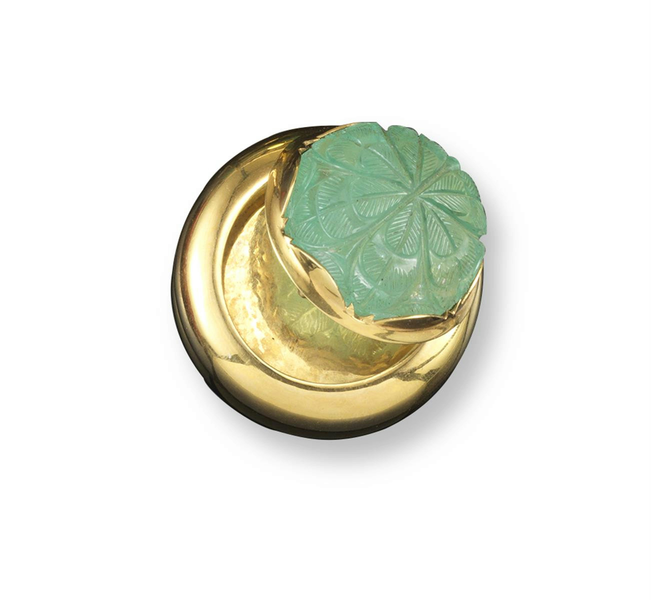 A gold circular pill box, mounted with an emerald, the hinged cover mounted with a foliate carved circular cut emerald, the base also carved with a stylised flower head. The box 4cm wide.
