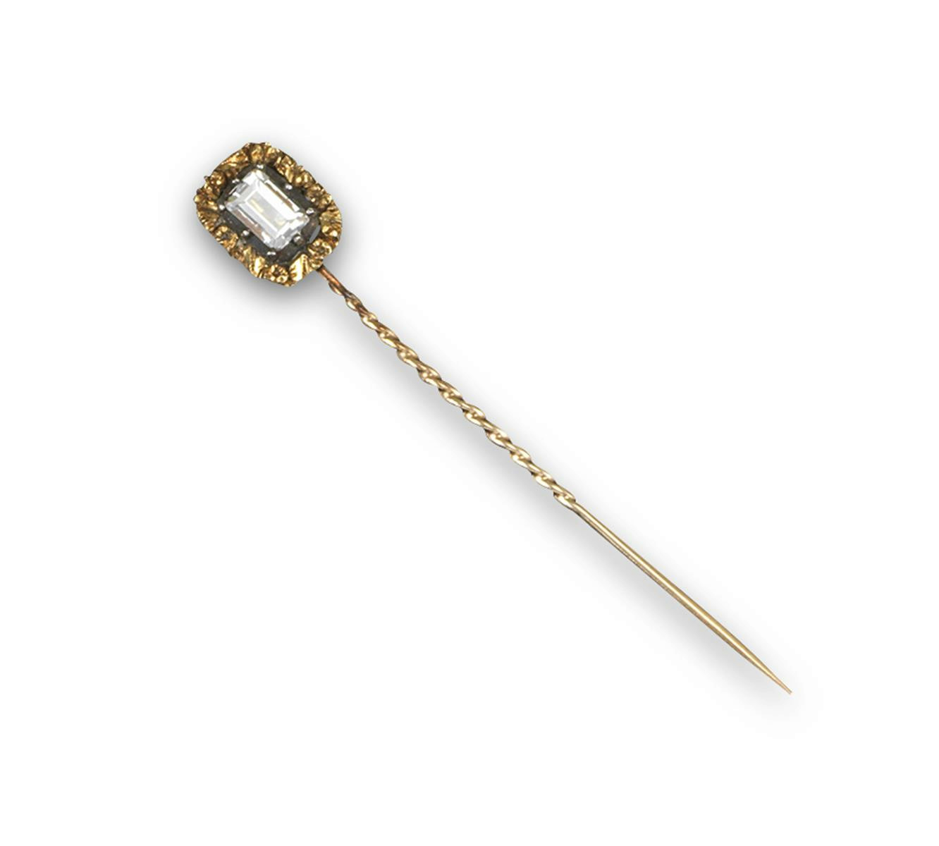 A Regency gold stick pin set with a baguette shaped diamond in a foliate carved mount. Case by...