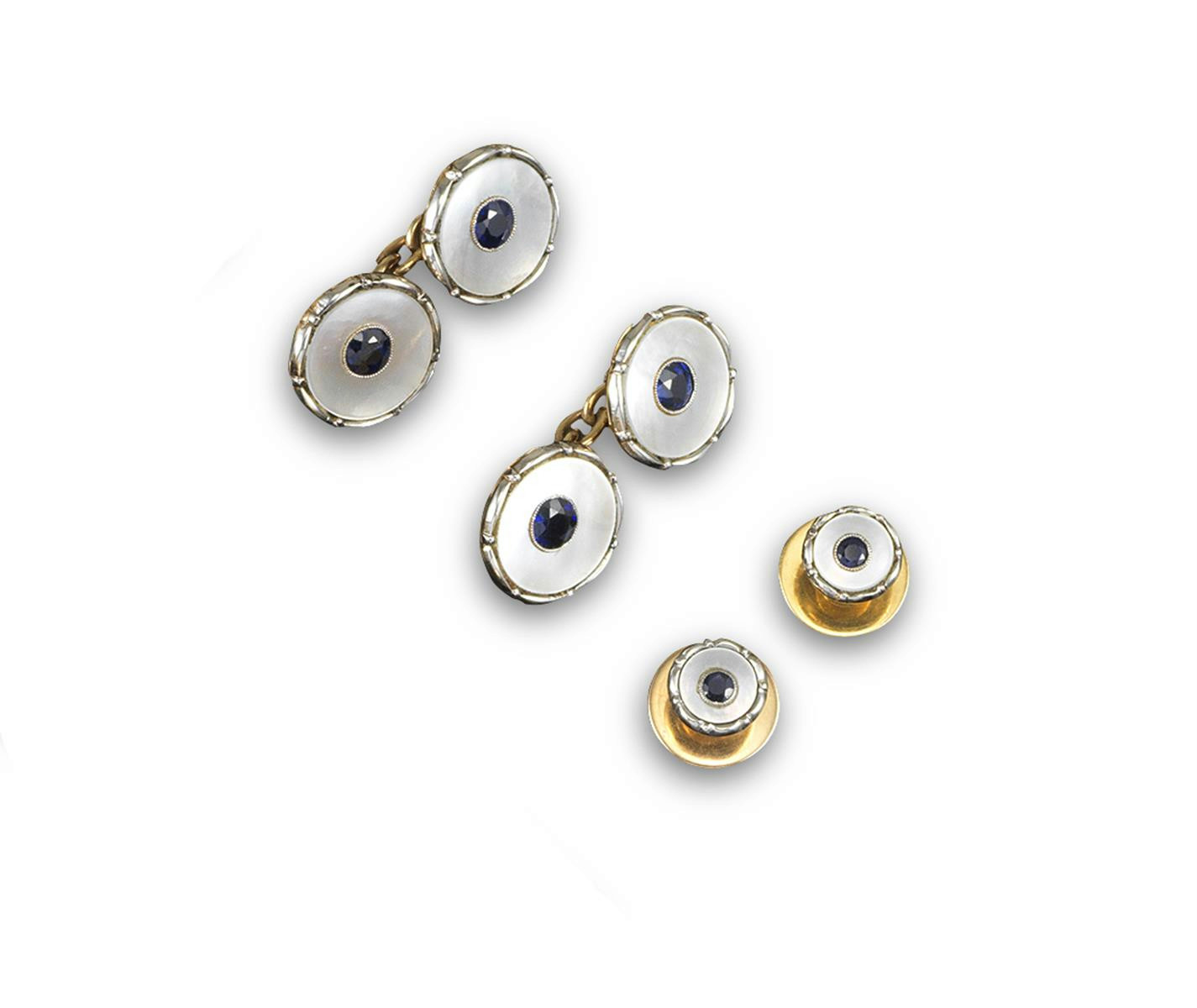 A pair of circular yellow and white gold dress cufflinks, each centred with a circular cut sapphire on mother of pearl ground. With cased matching pair of dress studs.
