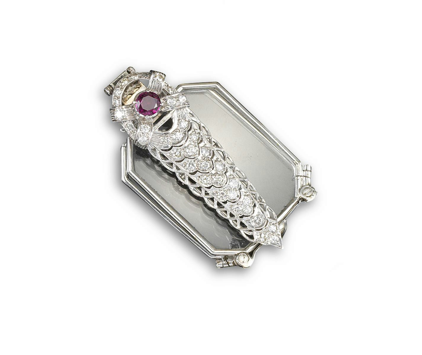 A pair of white gold folding lorgnette, the handle set with diamonds and a circular cut ruby.