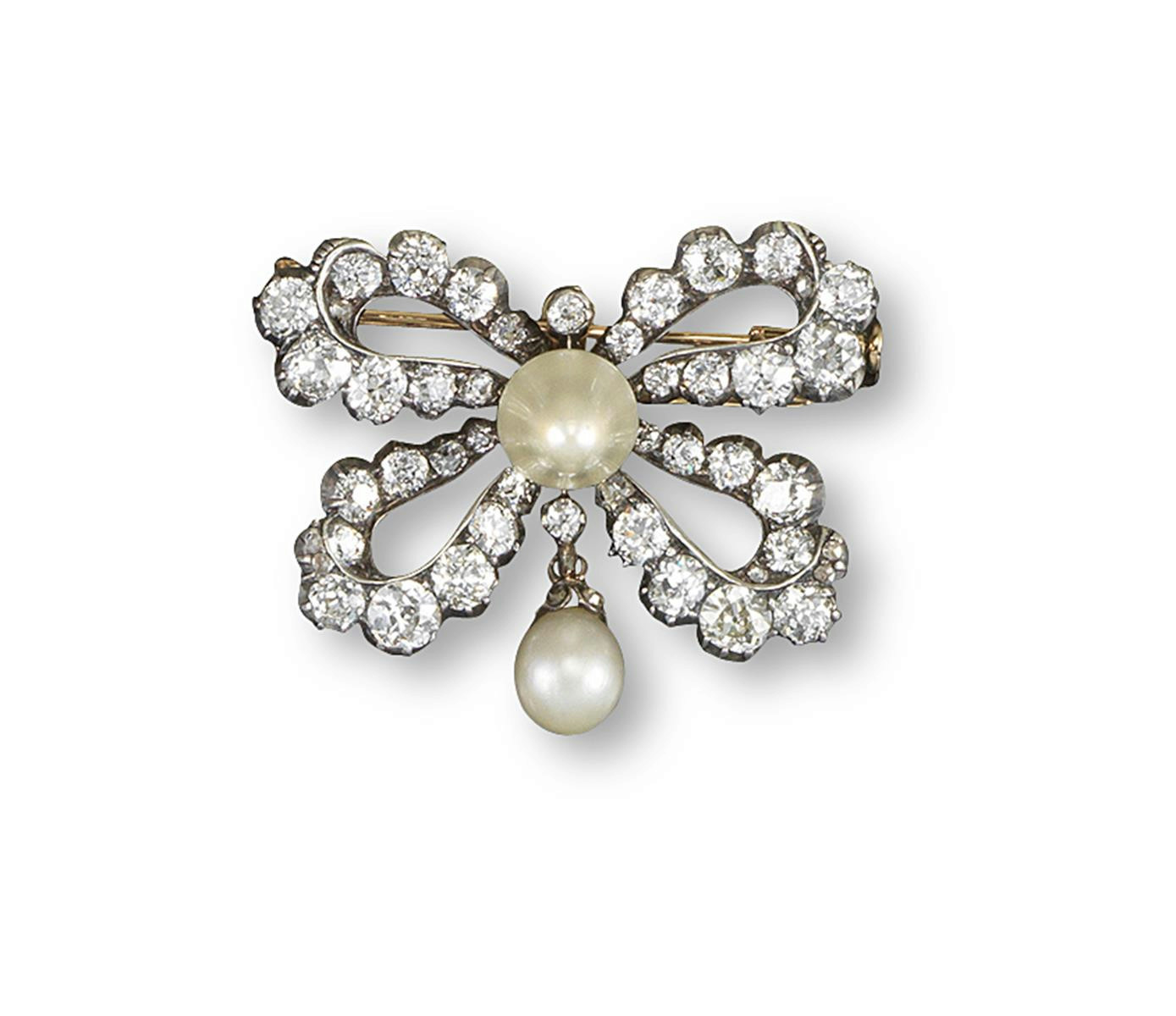 A 19th century diamond and natural pearl bow shaped brooch, set overall with graduated old circular cut diamonds and centred with a conical pearl and suspending a smaller oval pearl pendant. Set in silver and gold.