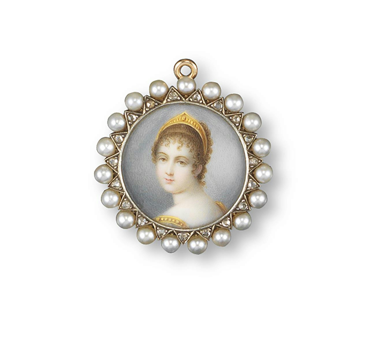 A 19th century gold brooch pendant, mounted with a circular portrait of a lady looking over her left shoulder and wearing her hair up in a kokoshnik style head ornament. The frame alternately mounted with rose cut diamonds and seed pearls, folding pendant loop. The reverse engraved I.E. April 10th 1888. Mme Pallien. Jaques & Marcus. 3cm wide.