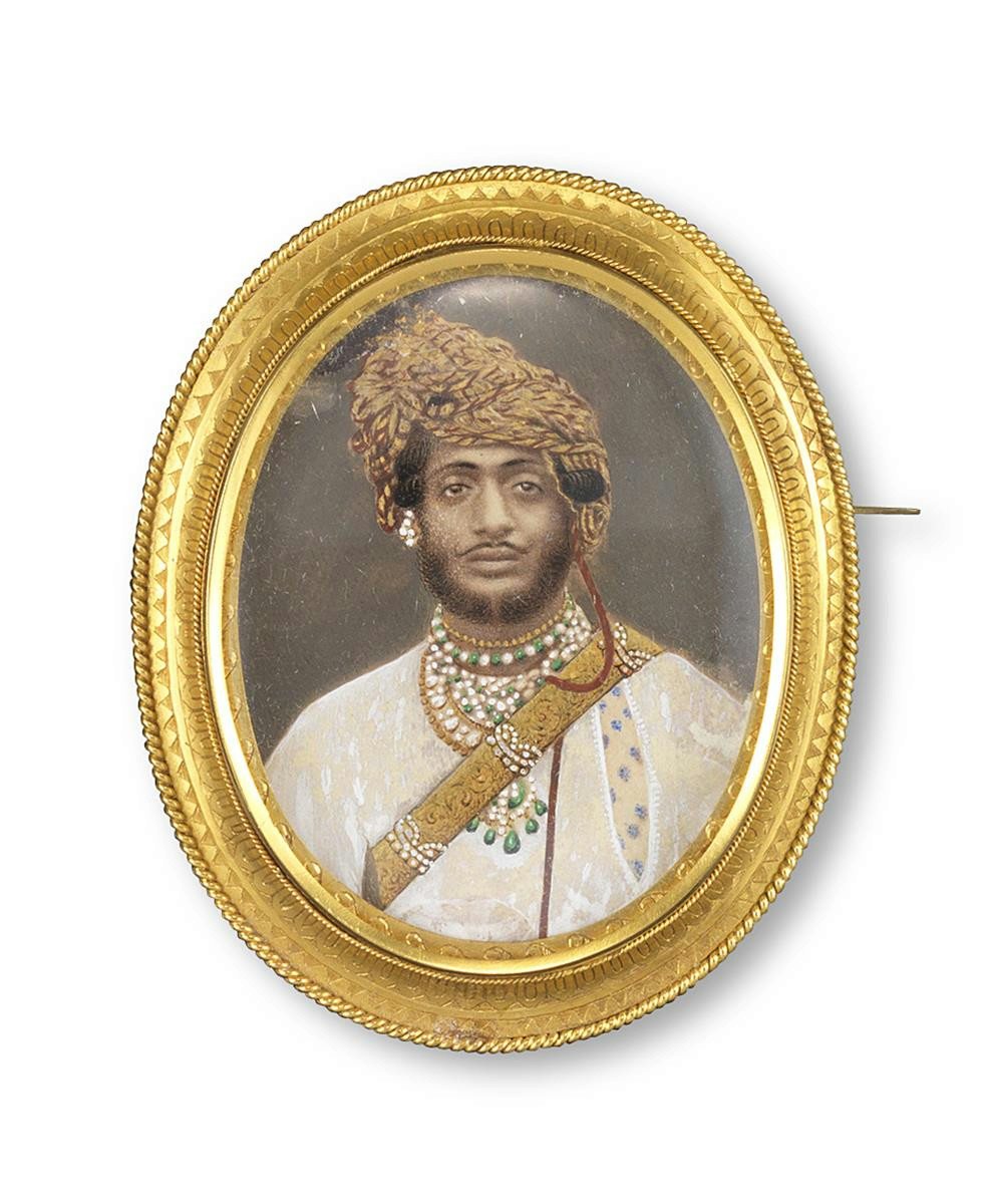 A 19th century oval brooch depicting an Indian gentleman within ropetwist and textured border....
