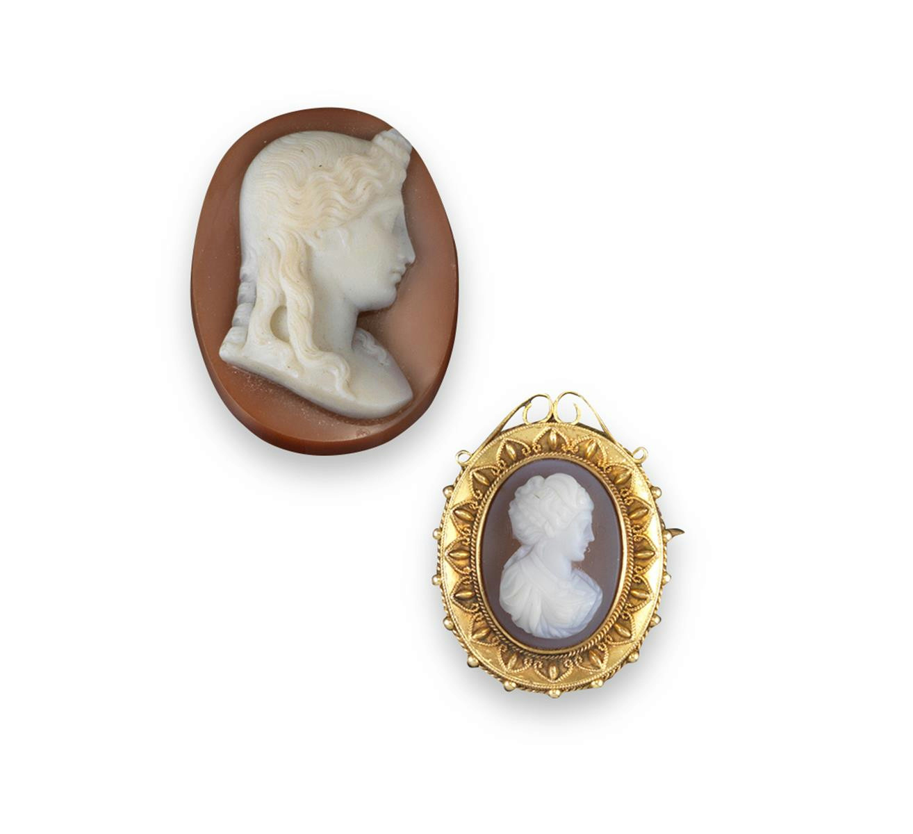 A carved hardstone cameo depicting the profile of a woman with flowing hair and a carved hardstone cameo mounted gold brooch.