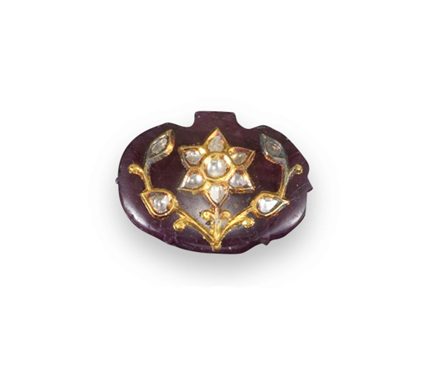 A carved ruby bead, applied with a diamond set gold flower head and carved flower to the reverse. 2.5cm wide.