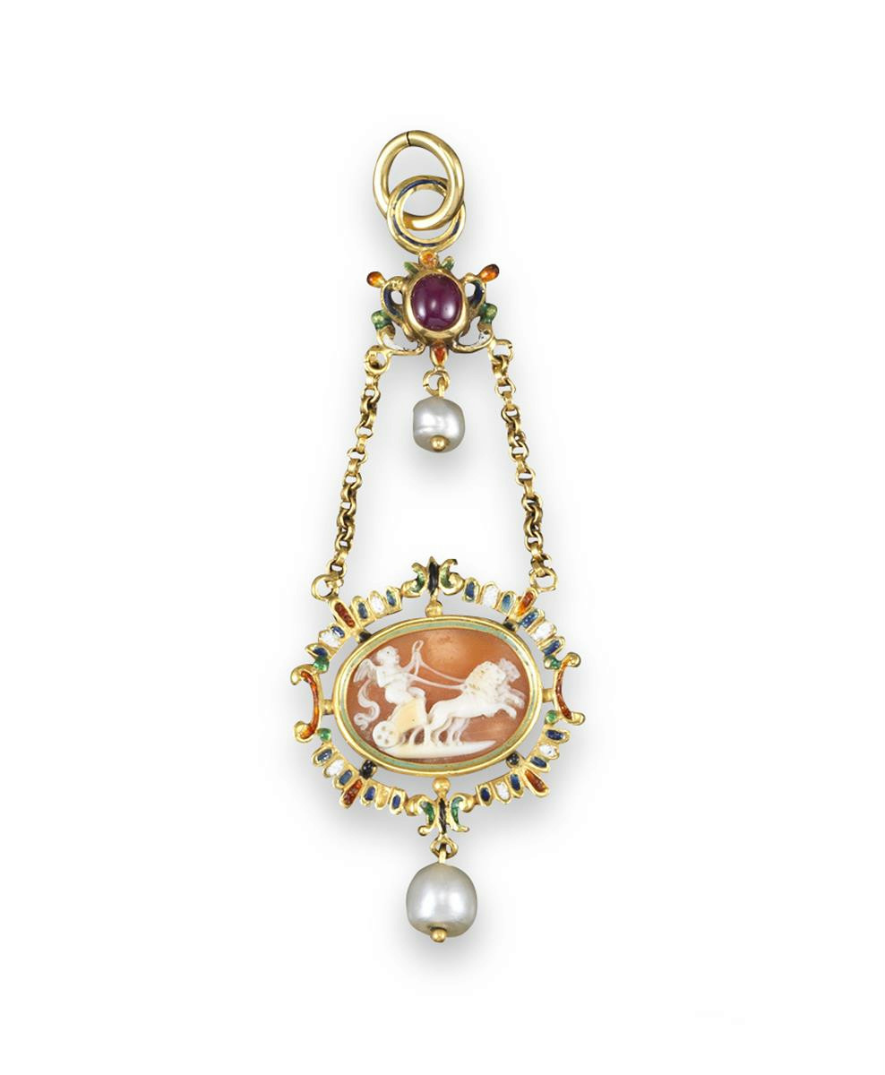 A gold pendant in the Renaissance style, mounted with a cameo depicting a putti in a chariot drawn by two lions in polychrome enamel frame, with cabochon ruby with two pearls. Enamel decoration continued to the reverse. 7cm.