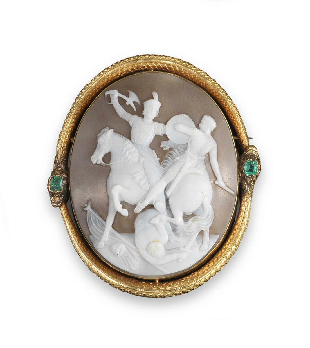 A 19th century cameo brooch, the well detailed carved shell cameo depicts two crusade inspired warriors on horses. The gold snake frame mounted with an emerald to each head. The cameo 5.5cm high.