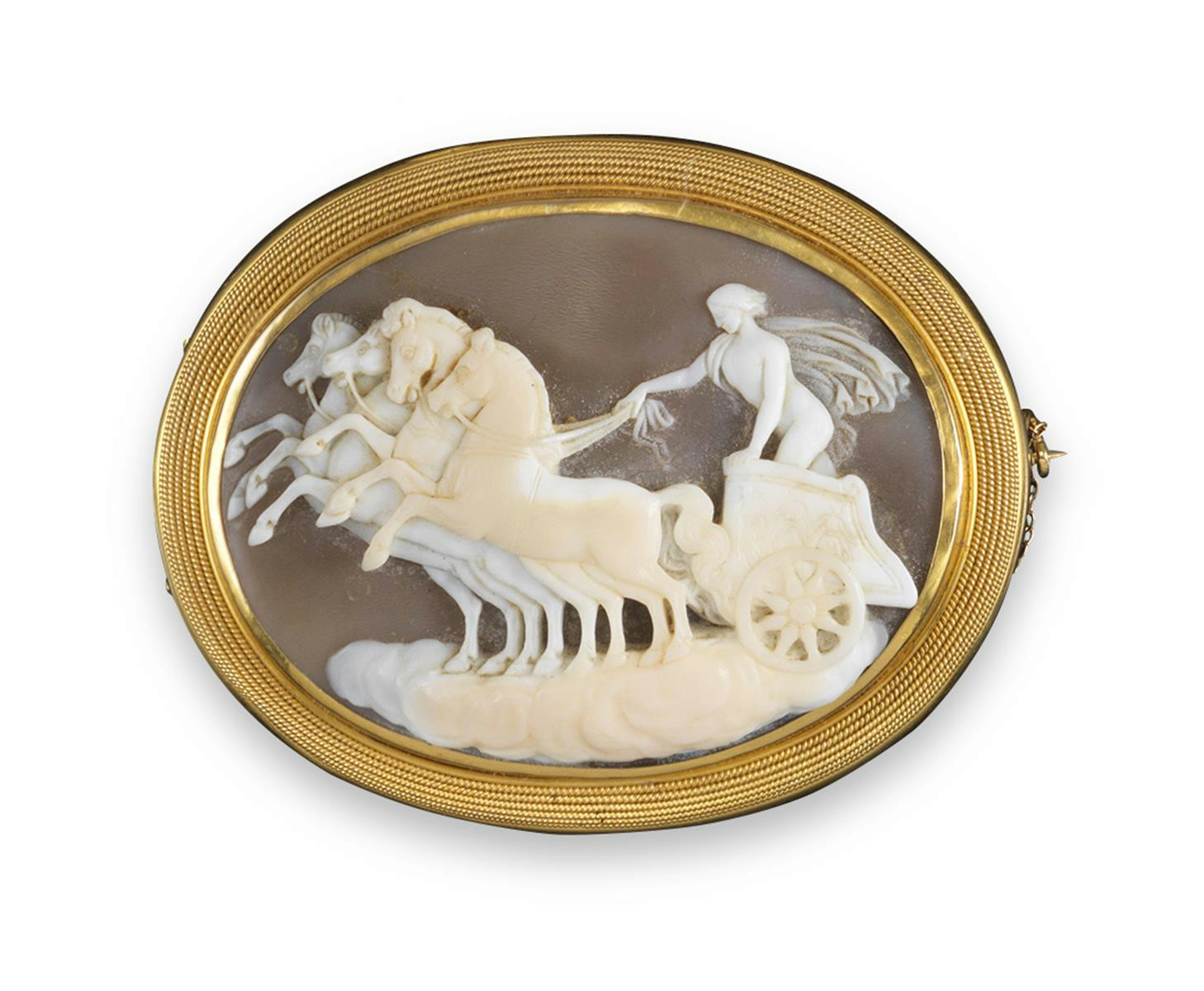 A 19th century carved shell cameo brooch, depicting a quadrigated chariot being driving by a man with flowing robes on a cloud. Mounted in a gold fine wirework frame. The cameo 5.5cm wide.