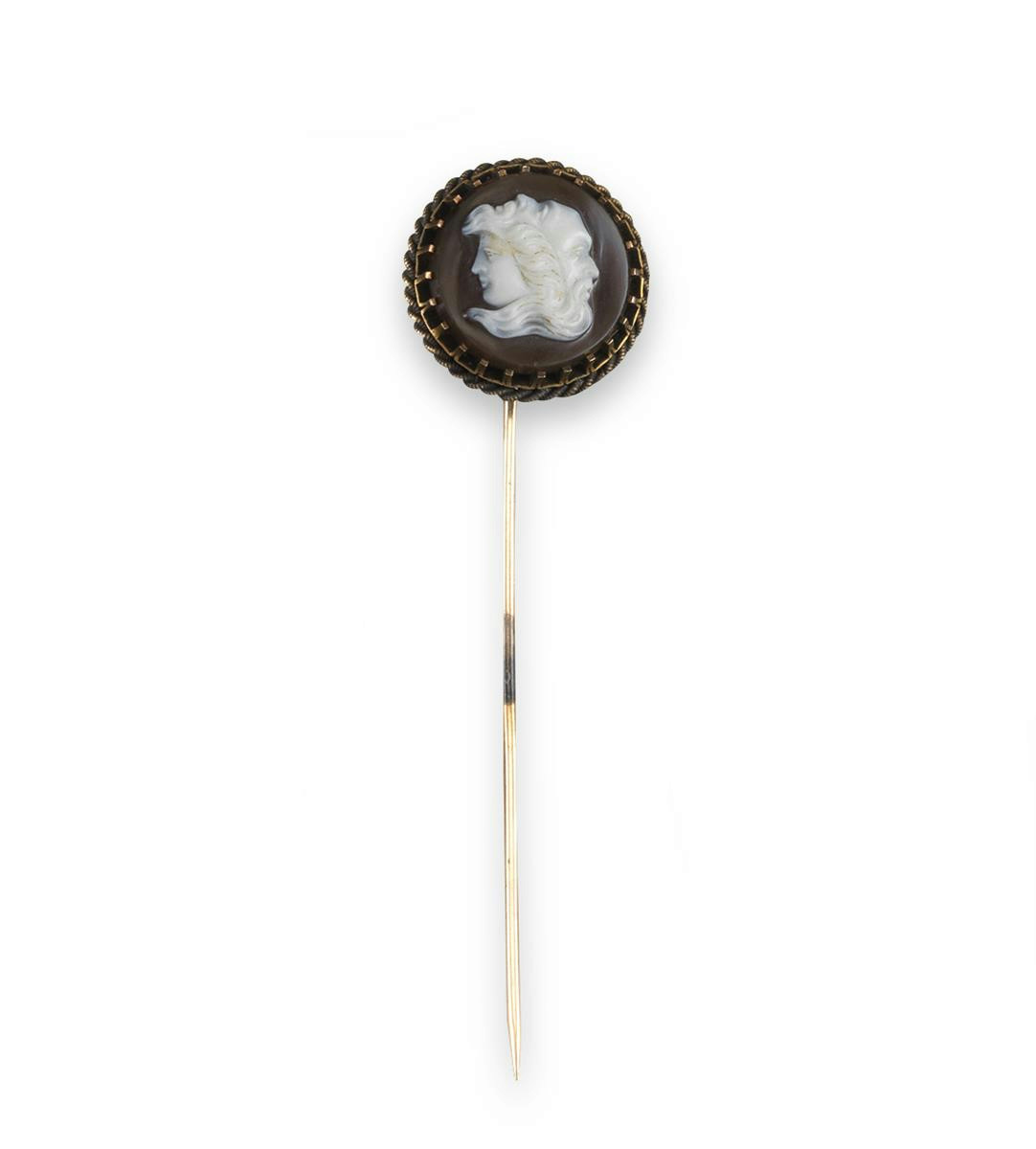 A late 19th century diamond set flower head brooch pendant, detachable brooch fitting. Set in silver and gold. A circular carved hardstone cameo depicting a gryllus of two bearded men and a woman. Gold mount. And a pair of gold drop earrings.