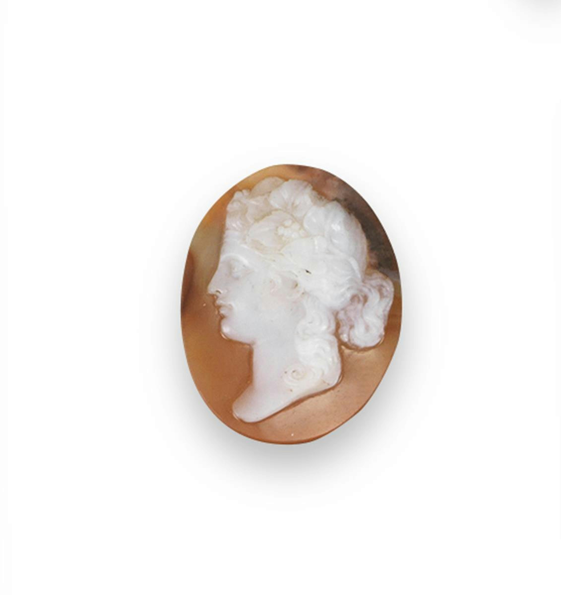 A carved hardstone cameo depicting the profile of a woman, her hair tied up with fruiting vines. 2.3cm high. And another oval shaped cameo depicting the profile of a man.