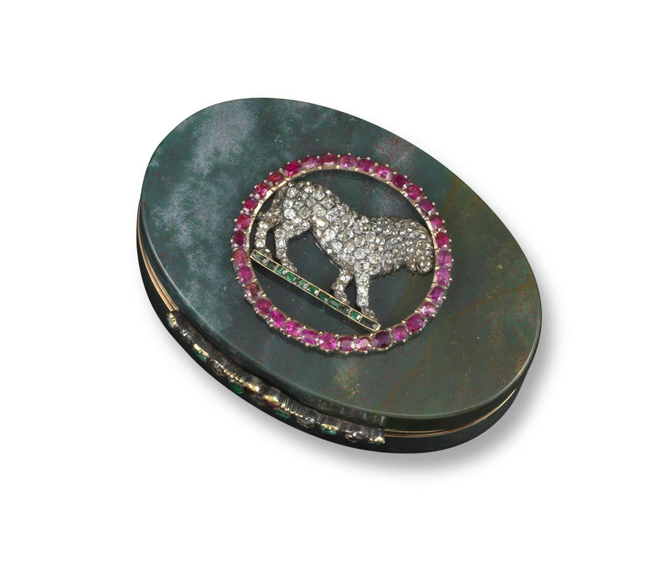 A George III bloodstone snuffbox, the hinged cover applied with a diamond set lion standing on a line of emeralds and within a circular border of rubies. The thumbpiece mounted with a line alternately set with emeralds, diamonds and surmounted with two further rubies. Gold mounts. 7cm wide.