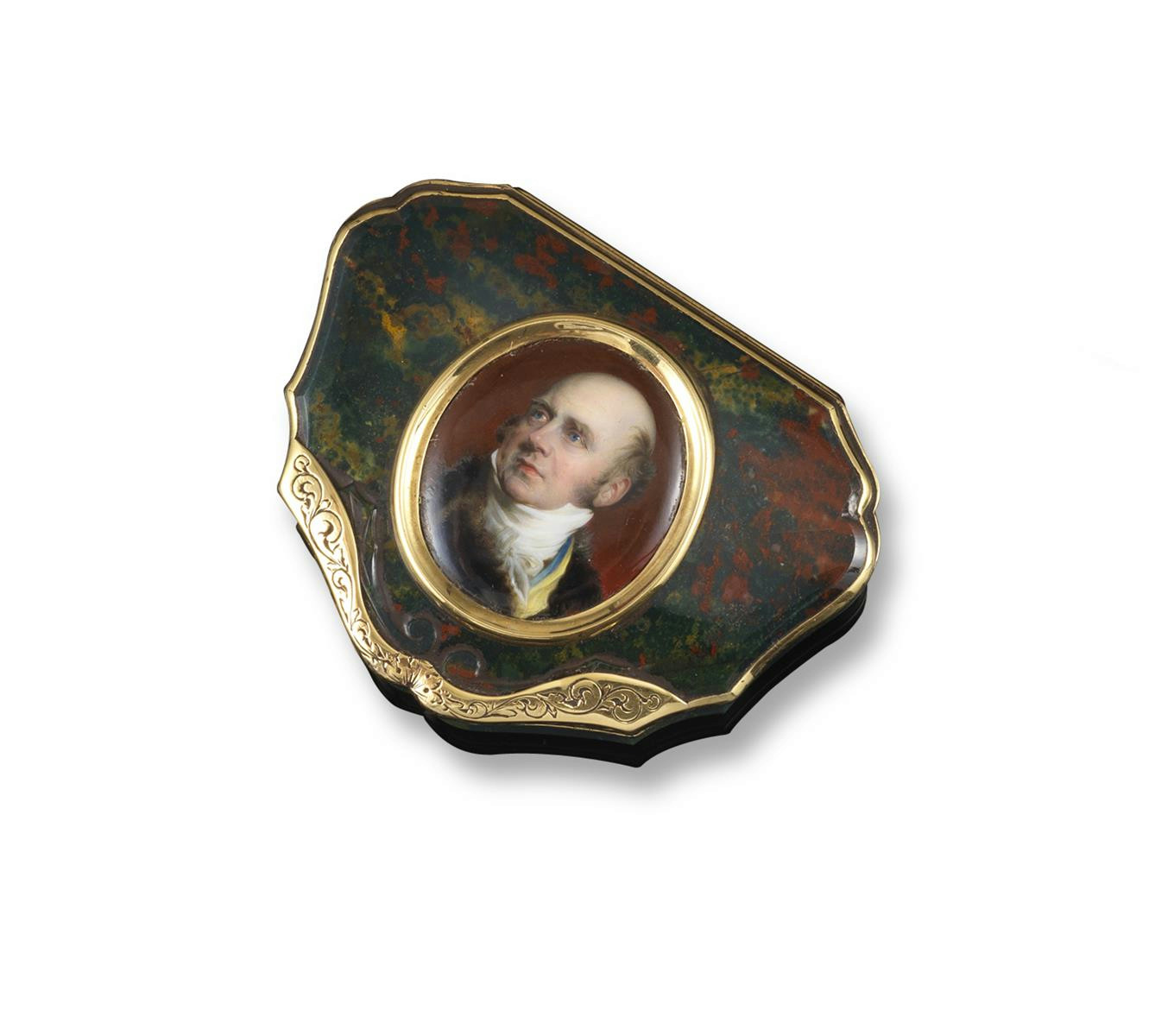 An early 19th century carved bloodstone snuff box. Foliate engraved mounts. Applied with an enamel miniature portrait of the 6th Duke of Bedford, possibly by William Essex (1784? - 1869) and after Sir Thomas Lawrence. Applied with an internal oval gold plaque engraved John Duke of Bedford 1823. The box 6.9cm wide. The portrait 3.1cm x 2.8cm. Fitted leather case.